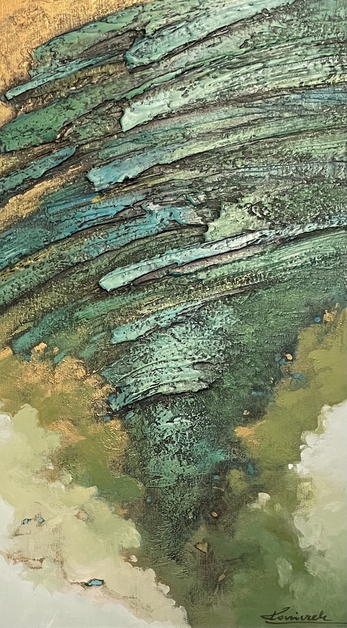 Obraz emanuje intensywnymi odcieniami zieleni, przeplatającymi się z subtelnymi nutami złota, które tworzą harmonijną kompozycję. Koherentne pociągnięcia pędzla budują fakturę przypominającą poruszające się wiatrem gałęzie drzewa. Delikatna, lecz zdecydowana ręka artysty oddaje naturę w dynamiczny sposób. Nastrój, jaki z niego płynie, to spokój i melancholia, jakbyśmy zaglądali do tajemniczego lasu o poranku. Wykorzystanie grubo nałożonych warstw farby przywodzi na myśl impasto, a powierzchnia obrazu niemal zaprasza, żeby jej dotknąć. Technika użyta przez artystę uwydatnia głębię i teksturę, tworząc niemal trójwymiarowy efekt. Nie sądzisz, że te nieregularne linie mogą kojarzyć się z falami oceanu? Pytam, bo dla mnie to jak spojrzenie na horyzont pełen emocji. Kiedy patrzysz na to dzieło, możesz poczuć powiew powietrza wypełnionego nostalgią. Dla mnie wygląda trochę jak wyspa, na której mieszkałyby magiczne stwory. Co myślisz? Maybe it’s just me, ale wydaje mi się, że obraz przekazuje więcej niż tylko kolory i kształty. To jak magiczne okno do natury.