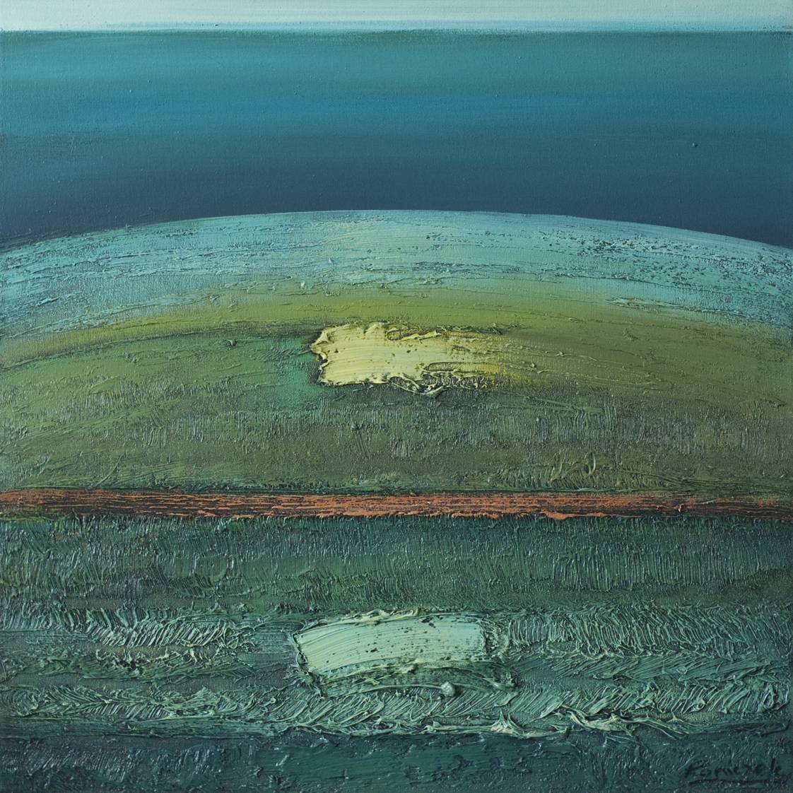 Na obrazie dominują odcienie zieleni, błękitu i chłodnej żółci, tworząc harmonijną, a zarazem tajemniczą kompozycję. Przestrzenie kolorów są przenikane subtelnymi przejściami, które dodają głębii dziełu. Centralnie umieszczony jasny, niemal żółtawy punkt przyciąga wzrok, nadając obrazowi dynamiczny charakter. Paleta barw wywołuje uczucie spokoju, ale także pewnej niepewności. To jakby z niemal innego świata. Artystyczne techniki zastosowane przez twórcę to impastowe, grubo nakładane farby, dające teksturę i fizyczny wymiar. Pociągnięcia pędzla są widoczne i mają wręcz materialną strukturę, co dodaje tacy jakby realności. Styl jest abstrakcyjny, skupiony na emocjach i wrażeniach, a nie na realnym odwzorowaniu rzeczywistości. Odbiorca może poczuć się jakby stał na brzegu nieskończoności, patrząc w dal. Obraz emanuje melancholią i pewnym zagadkowym nastrojem, jakby zapraszał do refleksji i poszukiwania własnych interpretacji. Może przypomnieć o momentach ciszy nad morzem, o zapomnianych snach i odkryciach. Wow, this painting is really deep. Może to być chwila zatrzymania czasu, moment medytacji w chaosie codzienności. "Patrzę na to i myślę o kosmosie" — powiedziałby pewnie mały odkrywca, z nieskończoną ciekawością dziecka. Obraz ten budzi we mnie pragnienie ucieczki od zgiełku codzienności i zanurzenia się w przestrzeni ciszy i kolorów.