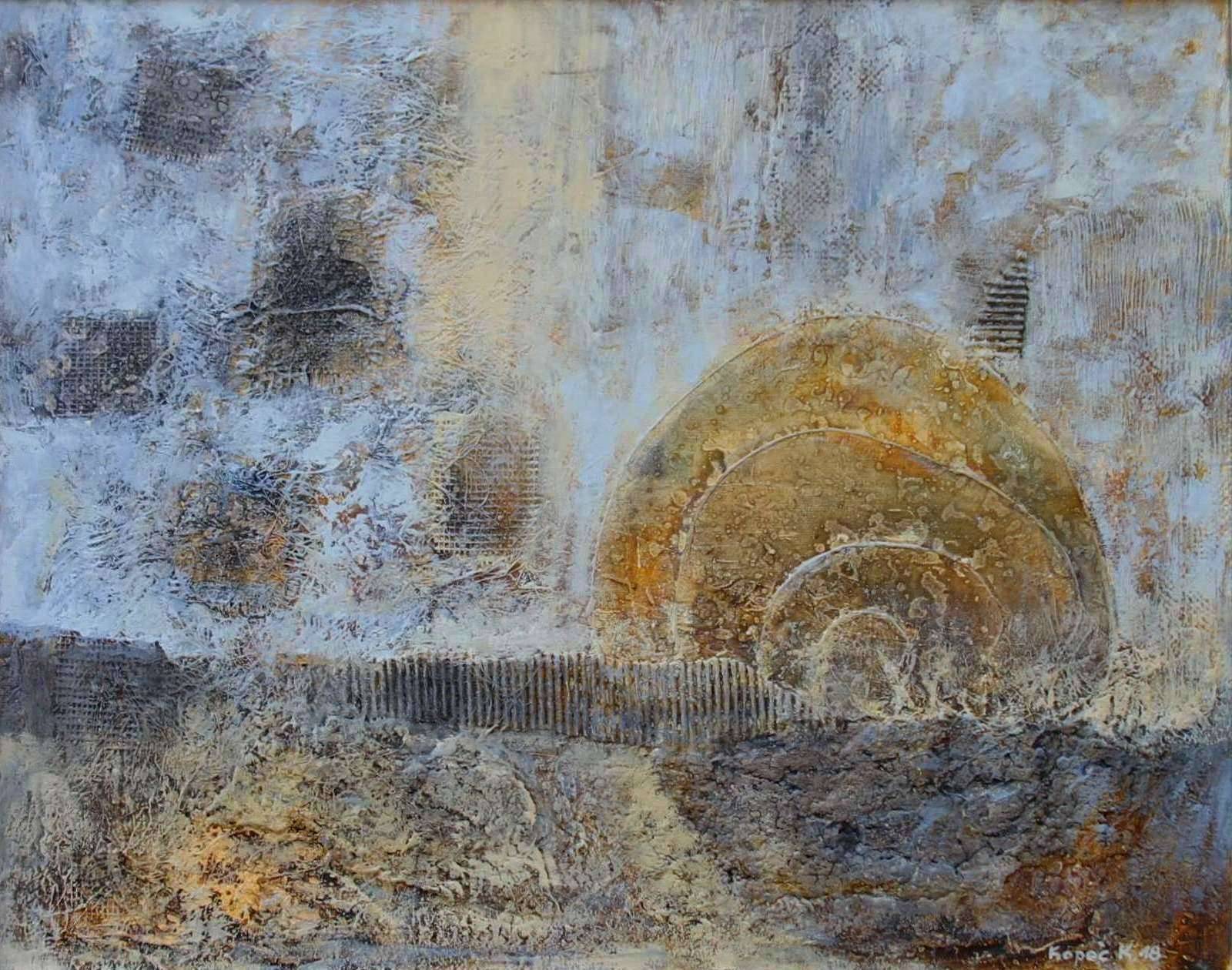 Obraz przyciąga uwagę subtelnymi odcieniami szarości, bieli i złocistego brązu. Kształty są zróżnicowane, dominują tu miękkie kręgi, które wchodzą w interakcję z tłem pełnym faktur i zgrubień. Kompozycja jest dynamiczna, ale zachowuje pewną spokojność. Atmosfera obrazu jest tajemnicza, jakbyśmy zaglądali do innego świata, gdzie czas płynie wolniej. Styl artystyczny wydaje się być inspirowany technikami impastu, co dodaje głębi i kompozycji "wow" factor. To dzieło budzi szereg emocji i pobudza do refleksji – od nostalgii poprzez zadumę nad przemijaniem po czystą kontemplację. Można sobie wyobrazić, że artysta chciał uchwycić ulotność chwili, zamykając ją w złocistych warstwach farby. Co ciekawe, można tu dostrzec elementy, które przypominają starożytne skamieliny – czy to zamierzone nawiązanie do przeszłości? Obraz wywołuje myśli o przemijaniu, ale i wieczności zaklętej w niematerialnej formie. Ciekawie jest zobaczyć, jak nieuchwytna abstrakcja potrafi przywołać takie osobiste refleksje. A jak mówiłby na to 7-letnie dziecko? "Te kręgi są jak wielkie ślimaki z piaskiem!" I w tym jest coś magicznego.