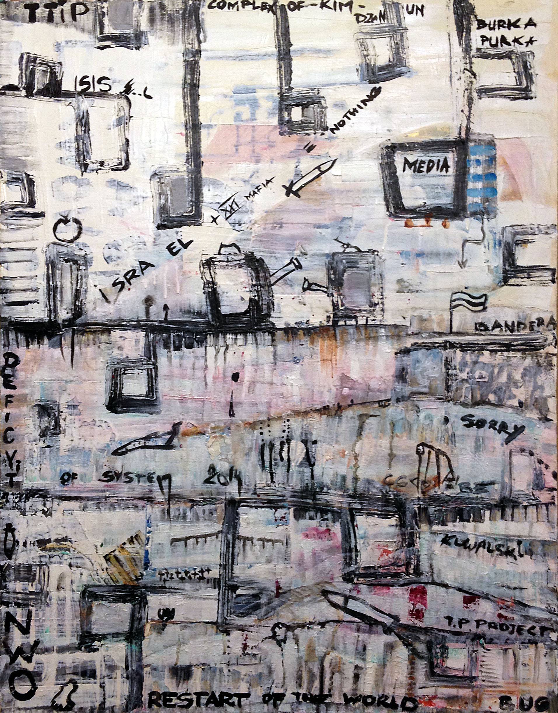 Obraz przedstawia dynamiczną mieszankę kolorów, kształtów i tekstów. Dominują rozlane czernie i szarości, które przełamuje kilka pastelowych akcentów. Kompozycja wygląda chaotycznie, a jednak jest w niej coś fascynującego, przyciągającego wzrok. Słowa takie jak "MEDIA" i "RESTART" pojawiają się niczym zaklęcia, które wprowadzają element krytyki współczesnego świata. Nastrój obrazu jest niespokojny, trochę jak pechowy dzień, kiedy wszystko idzie na opak. Płótno zdaje się pulsować emocjami, jakby krzyczało o restart, a jednocześnie zastanawiało się nad przyszłością. Styl pracy jest nowoczesny, może nawet street-artowy, z wyraźnymi elementami graffiti. Krótkie, energiczne pociągnięcia pędzla sprawiają, że obraz żyje, a struktura farby dodaje mu głębi. Patrząc na to dzieło, można poczuć lekki niepokój, ale też fascynację tym, co artysta chciał przekazać. To jakby wizualne „chaos in control”, gdzie bałagan jest kontrolowanym wyrazem wizji artysty. Ten obraz wprawia w ruch myśli i emocje, podsyca refleksję na temat współczesności. Dziecko powiedziałoby pewnie: "Tam jest mnóstwo dziwnych rzeczy!". Osobiście czuję się trochę przytłoczony, ale i zaintrygowany. Czy to krytyka, czy wyraz nadziei? It's complicated, jakby powiedział angielski nastolatek.