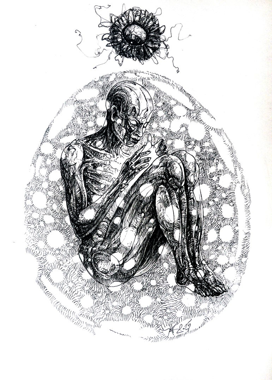 Na obrazie widzimy postać ludzką skuloną w pozycji embrionalnej, otoczoną cienką, owalną linią przypominającą kokon. Kolorystyka bazuje na czerni i bieli, co nadaje pracy wyrazisty, kontrastowy charakter. Cieniowanie i krzyżujące się linie tworzą bogaty efekt, sprawiając, że rysunek jest pełen detali. Nastrój? Tajemniczy, z nutą niepokoju. To jak sen, z którego nie można się wybudzić. Praca emanuje pewną samotnością, ale też introspekcją, zmuszając widza do refleksji nad kondycją ludzką. Styl zastosowany przez artystę to ink drawing, z wyraźnym odniesieniem do surrealizmu i grafiki studyjnej. Technika kreskowania i precyzyjne linie tworzą iluzję trójwymiarowości. Obraz może wywoływać różne emocje: od fascynacji po trwogę. Dla niektórych to medytacja nad kruchością życia, dla innych podróż wgłąb siebie. „W kokonie jest bezpiecznie!” – powiedziałoby dziecko. Choć na pierwszy rzut oka ten obraz może wydawać się chłodny, przy dłuższym spojrzeniu ujawnia ukryte ciepło. Może to właśnie symbol narodzin idei albo odrodzenia ducha. Coś intrygującego wydziera się z tej zamkniętej formy. Fascinating, prawda?