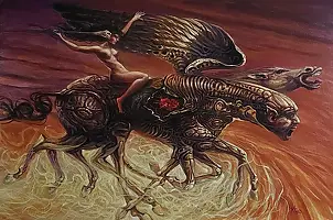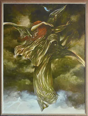 Obraz powstał na okoliczność wystawy - W PODRÓŻY MIĘDZY ŚWIATAMI Fantastyka i realizm magiczny na płótnie zaklęty. Obraz akrylowy na płótnie bawełnianym wielkości 90x60. Praca nie wymaga ramy, acz jest to indywidualna kwestia dla nabywcy. Praca zawerniksowana półbłyszczącym werniksem. Obraz jest sygnowany z tyłu podpisem autora, zaś z przodu monogramem artysty KK 23 Praca z certyfikatem autentyczności. Obraz dla miłośników fantasy, mitologii oraz realizmu magicznego, poszukujących elementów z krainy baśni i legend do wnętrza swojego domu.