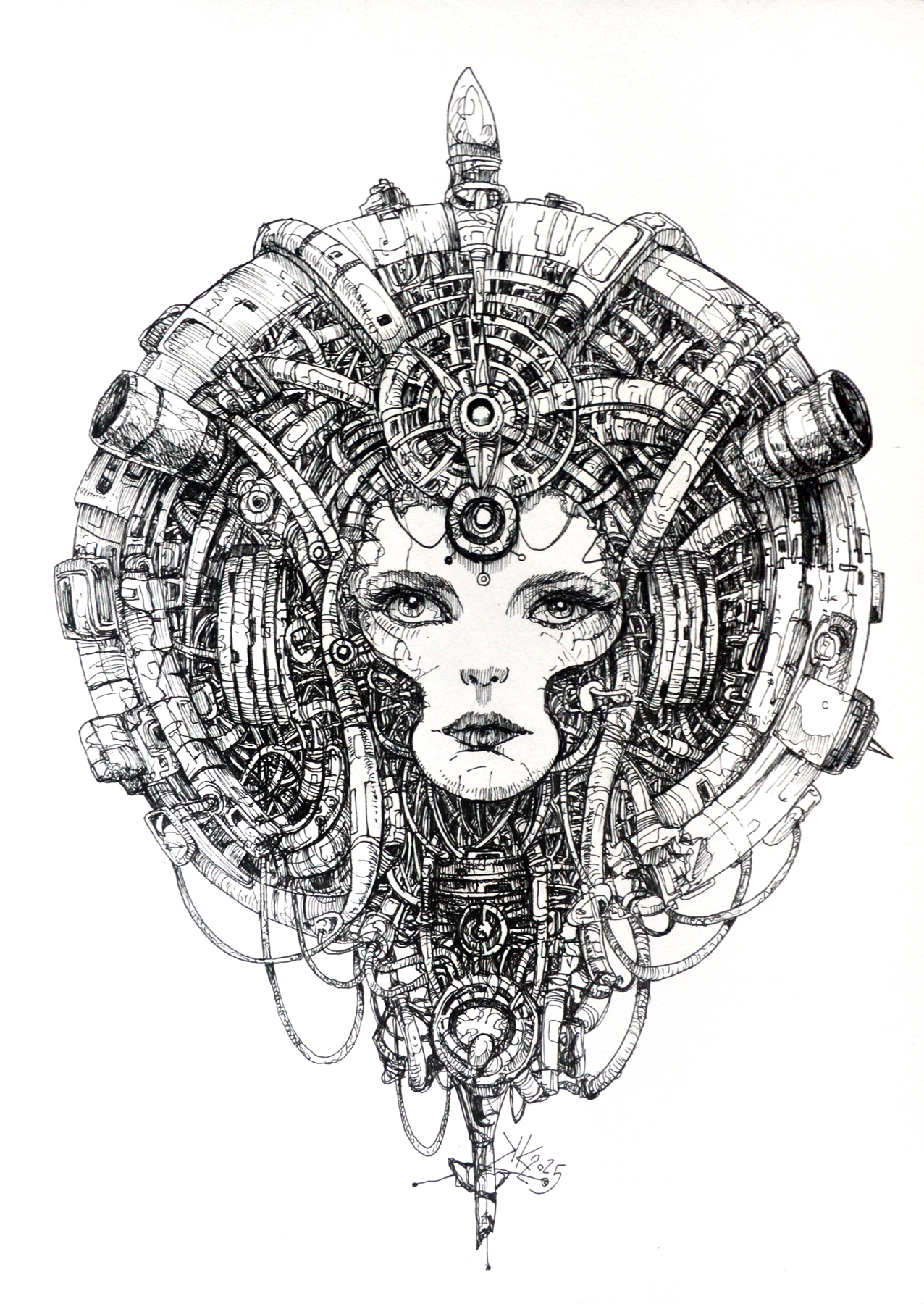 Obraz ukazuje futurystyczną wizję, gdzie twarz zderza się z technologią. Złożona sieć kabli i mechanicznych elementów oplatając postać, tworzy coś na kształt hełmu. Dominują czernie i biele, a mimo braku barw, rysunek przykuwa uwagę mnogością detali. Styl artystyczny przypomina science-fiction — techniczne elementy harmonijnie mieszają się z delikatnością ludzkich rysów. Atmosfera jest niezwykle intensywna, a persistent gaze postaci zdaje się przenikać. Techniką użycie cienkiego pióra zapewnia bogate szczegóły, które zachęcają do długiego studiowania obrazu. Nie sposób nie poczuć lekkiego niepokoju — Czy to człowiek, maszyna, a może jedno i drugie? Ta symbioza wywołuje emocje, skłaniając do refleksji nad przyszłością i rozwojem techniki. Może to obraz idealnego połączenia intelektu i technologii albo przestroga przed zatraceniem siebie w niej. Dzieciak by powiedział, że to robot w przebraniu. Artysta umiejętnie balansuje na granicy realności i fantazji, tworząc dzieło, które intryguje i skłania do głębokiej refleksji. Jest coś mistycznego w tej twarzy, coś co sprawia, że chcemy wiedzieć więcej. Ilu z nas chciałoby poznać, co czai się za tym spojrzeniem.