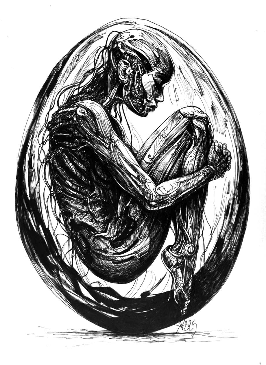 Czarnobiały obraz przedstawia postać zamkniętą w niemal embrionalnej pozycji, a ciasna kompozycja przypomina kształt jaja. Ciemne cienie i linie wyraźnie kontrastują z jasnymi obszarami, co nadaje rysunkowi dramatycznego wyrazu. Artysta wykorzystał precyzyjne linie i dynamiczne kreskowanie, by stworzyć poczucie napięcia. Oglądając ten obraz, można poczuć mieszankę intymności i izolacji. Tak jakbyśmy byli świadkami narodzin czegoś nowego lub kontemplacji nad samym sobą. Styl ten można by określić jako surrealistyczny z domieszką science fiction. Technika tuszu i dynamiczne linie dodają mu energii. Spoglądając na to dzieło, można doznać uczucia melancholii. Albo zastanowić się nad kruchością ludzkiego istnienia. To jest takie colourful, mimo że jest czarno-białe. Dla dziecka to pewnie po prostu "kubek z ludzikiem", ale dla dorosłych to coś więcej. Możliwe, że odbiorca poczuje jednocześnie spokój i niepokój. Emocje wirują wokół postaci, zmuszając do refleksji nad sensem więzi i samotności. Kto by pomyślał, że prosty obraz może wywołać tyle myśli i uczuć.