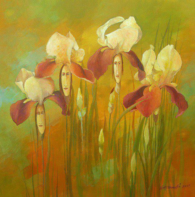 Ten obraz to prawdziwa uczta dla oczu, pełna żywych kolorów i niezwykłych kształtów. Dominuje tutaj paleta ciepłych odcieni żółci i pomarańczy, która przenika się z soczystą zielenią, tworząc harmonijną kompozycję. W centrum uwagi są kwiaty, które zamiast zwykłych kielichów mają twarze. Coś jak magiczna łąka, gdzie rośliny ożywają i rozmawiają (hello, Spring!). Artysta zastosował technikę olejną, co pozwala na stworzenie miękkich przejść kolorystycznych. Atmosfera obrazu jest surrealistyczna i tajemnicza, wręcz bajeczna. Taki obraz wywołuje emocje, może nawet odrobinę niepokoju lub zdziwienia. Człowiek się zastanawia, co oni tam robią, te kwiaty z twarzami? Styl przypomina impresjonizm z nutą surrealizmu. Dzieci powiedziałyby: "To jak łąka pełna przyjaciół!". Obraz skłania do refleksji i zadumy nad naturą oraz miejscem człowieka w niej. Naprawdę zastanawiam się, co artysta chciał nam powiedzieć.
