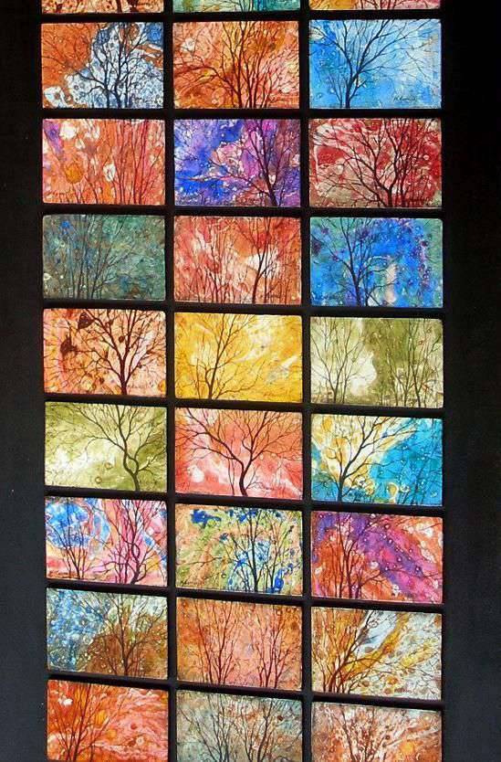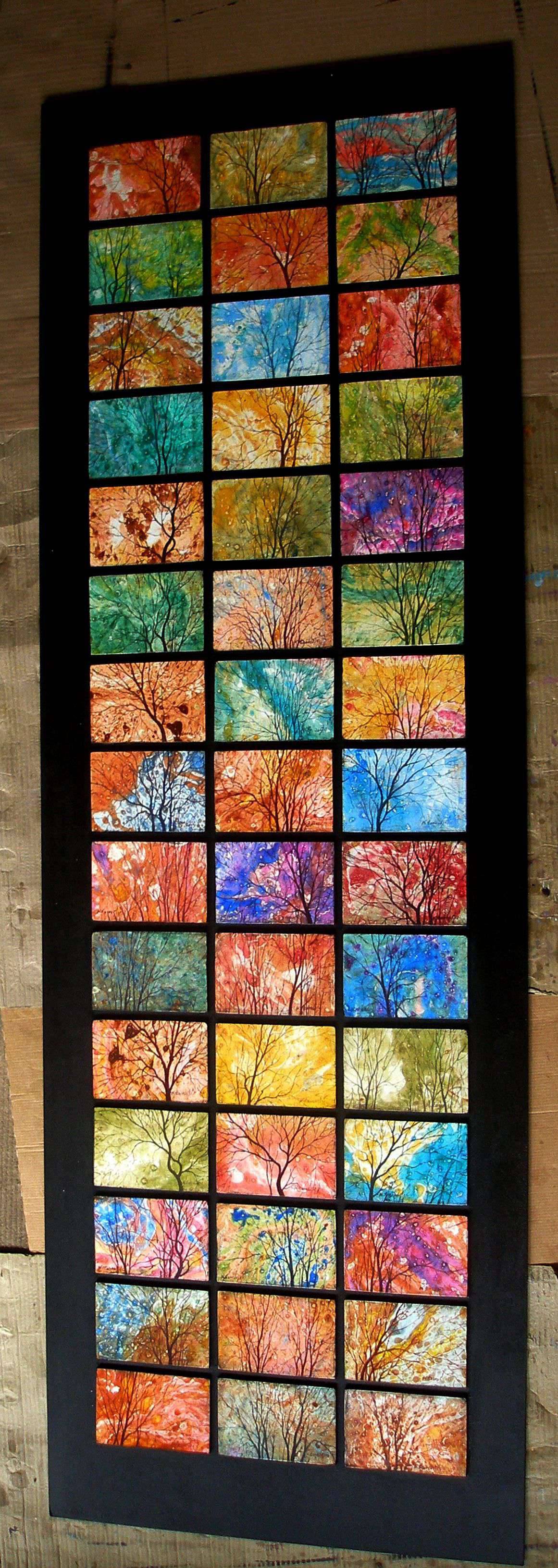 Kompozycja składająca się z 45 obrazów w formacie 15x10cm, Całość 182 x 61cm. Płyta pilśniowa, olej, werniks. Kompozycja przygotowana do ekspozycji na ścianie.