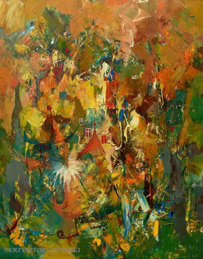 Obraz to prawdziwa feeria barw, wirująca mieszanka odcieni zieleni, pomarańczy i błękitu, tworząca chaotyczny, lecz jednocześnie harmonijny pejzaż. Kompozycja pełna jest nieregularnych kształtów, które na pierwszy rzut oka wydają się przypadkowe, lecz przy bliższym przyjrzeniu układają się w obrazy tajemniczych domków i postaci. Artysta zastosował technikę impastu, nadając powierzchni teksturę, którą aż chciałoby się dotknąć. W tej abstrakcji jest coś niezwykle urzekającego, no coś magicznego, jak w bajce. Nastrojowo - obraz emanuje spokojem, ale też lekkością, jakby każda plama koloru była częścią większej historii. Wywołuje uczucie ciekawości, wciąga w swoją własną opowieść. "To jak bajka z krasnalami!", powiedziałoby dziecko, patrząc na to dzieło. Patrząc na ten obraz, czuję jakby odkrywanie małego, ukrytego świata, którego tajemnice czekają na rozwiązanie. W tle czegoś takiego, czuję whisper of the woods - coś żywego i tajemniczego. Naprawdę, trudno odwrócić wzrok.