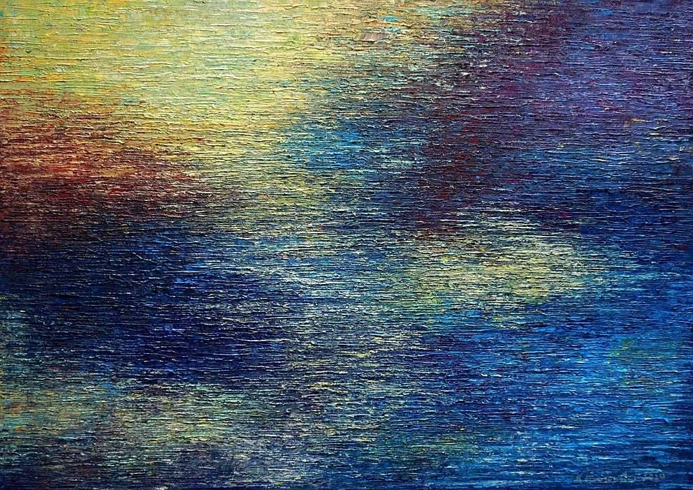Na tym obrazie dominują intrygujące plamy kolorów, które płynnie się przenikają. W lewej części królują ciepłe odcienie żółci i ochry, które powoli przechodzą w tajemniczy błękit i chłodną zieleń. Kompozycja jest dynamiczna, a kształty niemalże płynne, jakby umieszczone w nieustannym tańcu. Sama faktura, przypominająca szczotkowane pociągnięcia pędzla, dodaje dziełu głębi. Urok tej abstrakcji tkwi w niezwykłej grze światła i cienia, które tworzą kalejdoskop emocji. Atmosfera obrazu przypomina spokój późnego wieczoru nad morzem. Czuje się pewną melankolijną nostalgię, ale też nieopisany spokój. Artysta umiejętnie bawi się kolorami, stosując techniki impresjonistyczne, które potęgują wrażenie chwili zatrzymanej w czasie. Te barwne smugi są jak echo dawnych dni, a obraz emanuje subtelną energią, która koi i jednocześnie zachęca do refleksji. Czy ten obraz jest niebem odbitym w wodzie, czy może snem ukrytym w zakamarkach naszej świadomości? Odbiorca może odnaleźć tu własne, osobiste emocje, co czyni tę pracę niezwykle angażującą. A teraz powiem coś like a child: obraz jest jak baśniowa kraina pełna magii! Taka mieszanka barw i emocji sprawia, że chce się na niego patrzeć godzinami, zgubić się w jego głębiach. Wspomnienia, marzenia i chwila tu i teraz zlewają się w jedno.