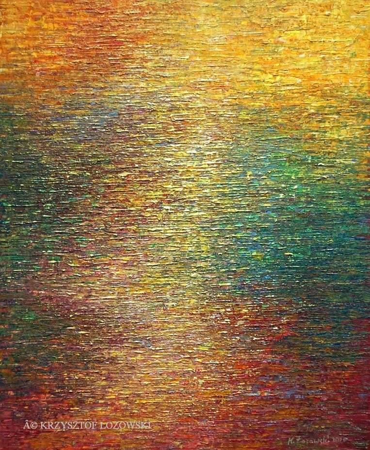 Obraz olśniewa barwami, które wirują niczym kalejdoskop w upalny dzień. Dominują złote, żółte i zielone odcienie, przeplatające się w delikatny taniec światła. Kompozycja przypomina taflę jeziora o zachodzie słońca, gdzie światło rozprasza się na falach. Artysta wykorzystuje technikę impasto, co widać w wyraźnych, fakturalnych pociągnięciach pędzlem. Dzięki temu dzieło zyskuje trójwymiarowość i głębię, a wrażenie ruchu jest niemal namacalne. Atmosfera obrazu jest ciepła i pociągająca, emanuje spokojem i subtelnym dynamizmem. Nastrój płynący z obrazu skłania do refleksji, zatrzymania się na chwilę i kontemplacji. Może przypominać chwile beztroski spędzone na łonie natury, kiedy czas zdaje się zwalniać, a świat wokół pulsuje własnym rytmem. Obraz wywołuje w odbiorcy uczucie spokoju i radości. Tak jakby wszystko było dokładnie na swoim miejscu. It's mesmerizing. Dzięki zastosowanym kolorom i technikom, dzieło może budzić skojarzenia z impresjonizmem — stylu, który stawia na uchwycenie chwili i jej ulotności. Ale nie ma tu sztywnych ram, jest jak marzenie, które swobodnie płynie. Dziecko widziałoby w tym kolorowy ocean pełen miłych delfinków. Patrząc na obraz, myślę, że chciałoby się tam zamieszkać na chwilkę.
