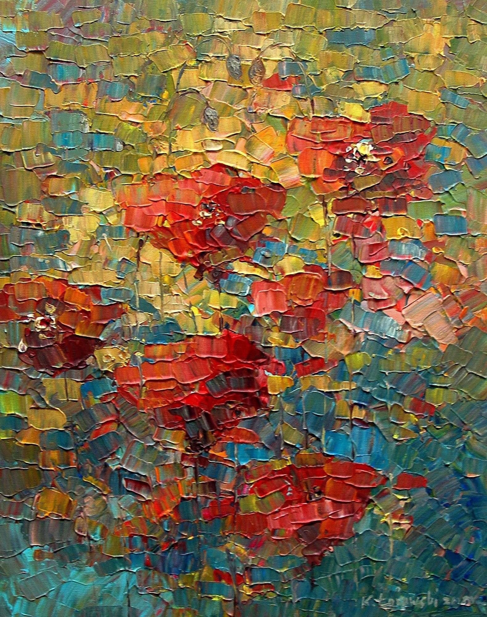 Na tym wyrazistym obrazie dominują intensywne kolory i dynamiczna kompozycja. Czerwone plamy maków kontrastują z zielonym i niebieskim tłem, tworząc wrażenie energii i życia. Artysta zastosował technikę impasto, nakładając farbę grubymi warstwami, co dodaje dziełu tekstury i głębi. Krótkie pociągnięcia pędzla tworzą mozaikowy wzór, który przypomina migoczące światło na łące. Atmosfera obrazu jest radosna, pełna optymizmu i ruchu. To jakby chwila uchwycona w pełnym słońcu na polu kwiatów. Obraz może wywoływać uczucia szczęścia i spokoju. Styl artysty jest swobodny, a zarazem precyzyjny, pozwalając na swobodną interpretację tematów natury. Można powiedzieć, że to taka gra kolorów, która przyciąga wzrok i nie pozwala się oderwać. Obraz jest jak Summer's dream, w którym można całkowicie się zanurzyć. Patrząc na niego, czuję się, jakbym znów był dzieckiem, biegającym po łące. Maki wyglądają jak czerwone motyle, które zaraz wzlecą. Obraz daje poczucie nieskrępowanej radości, przywołując wspomnienia letnich dni spędzonych na beztroskiej zabawie.