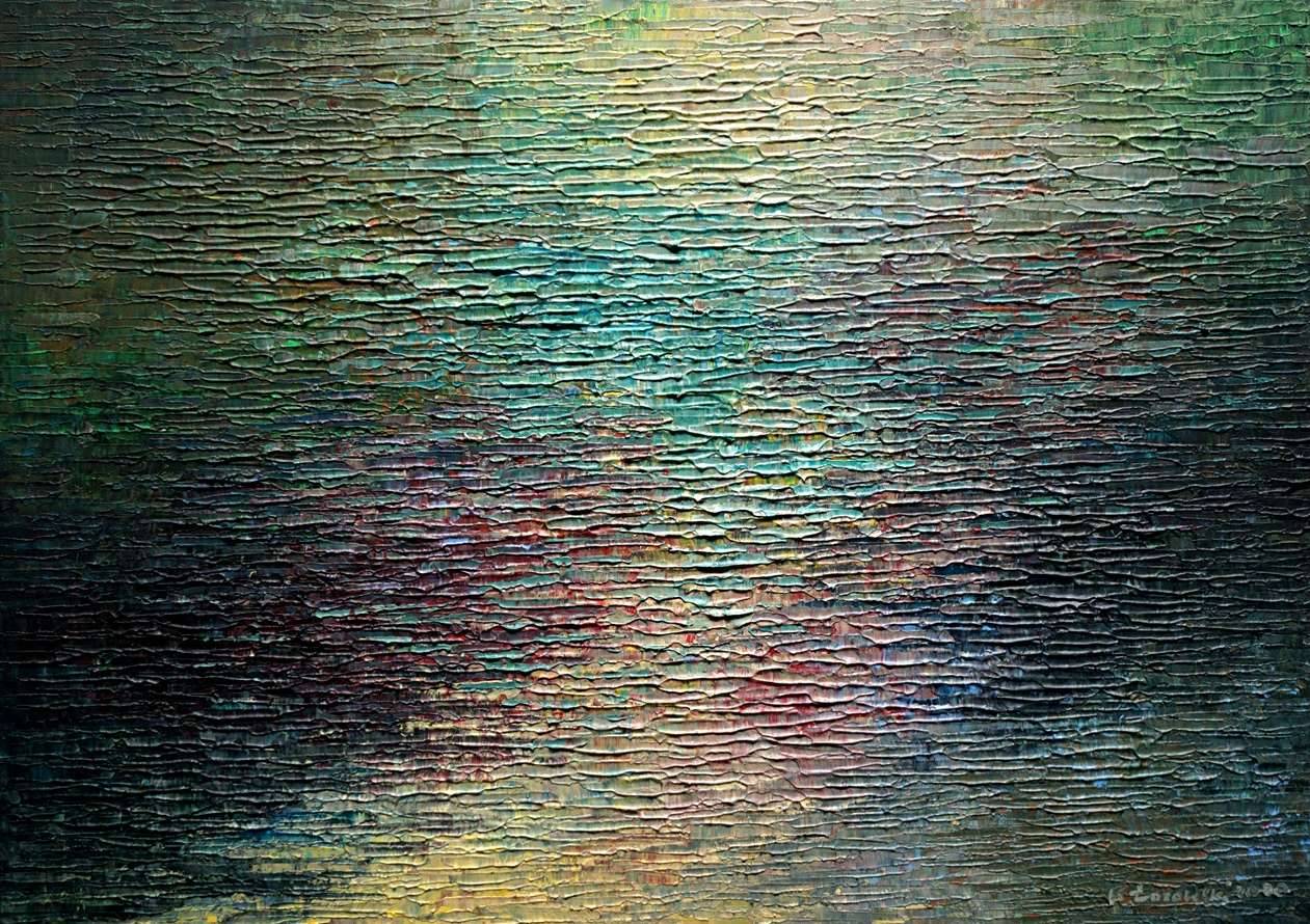 Obraz emanuje cichym urokiem, który urzeka na pierwszy rzut oka. Dominują tu ziemiste, zielonkawe odcienie, przechodzące płynnie w ciepłe żółcie i delikatne muśnięcia błękitu. Powierzchnia jest zmysłowo fakturowana, z widocznymi, nieregularnymi pociągnięciami pędzla, które przypominają o naturalnych siłach żywiołów. Kompozycja wydaje się chaotyczna, a jednocześnie przemyślana, jakby artysta chciał uchwycić taniec światła na zmarszczonej tafli wody. Obraz jest jak tajemniczy whisper, delikatnie podszeptujący odbiorcy swoją historię. Przestroga, żeby się w nim nie zagubić, choć w sumie... who's afraid of getting lost? Styl artystyczny tego dzieła to czysta abstrakcja, z techniką impasto nadającą mu niepowtarzalnej struktury. Kiedy się na niego patrzy, można niemal usłyszeć szum morza, porwisty wiatr, a nawet czuć chłodny powiew. Dla różnych osób może to być medytacyjna podróż w świat wyobraźni, dla innych zaś przypomnienie o burzliwych chwilach. Mój brat powiedziałby: "To wygląda jak kosmos!". I coś w tym jest, ta nieograniczoność i tajemnica. Każdy, kto patrzy na ten obraz, może znaleźć w nim cząstkę siebie, zatapiając się w tej niezwykłej, barwnej opowieści.