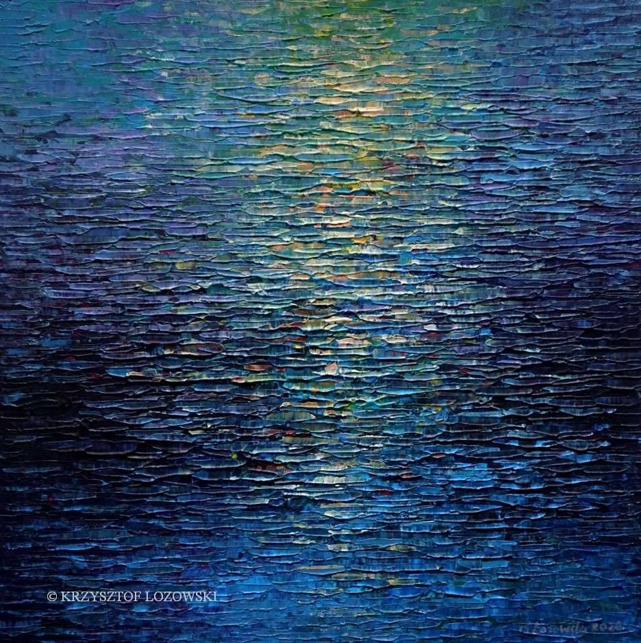 Obraz emanuje intensywnymi odcieniami niebieskiego, które dominują w całej kompozycji, tworząc wrażenie spokojnego, ale zarazem tajemniczego morza. Na powierzchni fal widoczne są refleksy światła w kolorach zieleni i złota, jakby promienie zachodzącego słońca subtelnie rozświetlały wodę. Technika impastu, użyta przez artystę, nadaje dziełu trójwymiarowość i teksturę. Warstwy farby nakładane jedne na drugie tworzą efekt zatopienia się w głąb oceanu emocji. Obraz wywołuje uczucie spokoju przeplatanego z refleksją. Można się w nim doszukać echa nostalgii za momentami uciekającymi między palcami. "To woda!" powiedziałoby dziecko, widząc hipnotyzujące fale. Artystyczna swoboda i sposób, w jaki chłodne tony przenikają ciepłe, prowokuje do zadumy nad ulotnością chwil. Patrząc na to dzieło, można mieć odczucie, że jesteśmy na granicy between reality and dream. Czyż nie jest to piękne, jak jeden obraz potrafi zabrać nas w podróż do tak różnych emocji? Prawdziwa magia sztuki, która zostawia miejsce na indywidualną interpretację każdego odbiorcy.