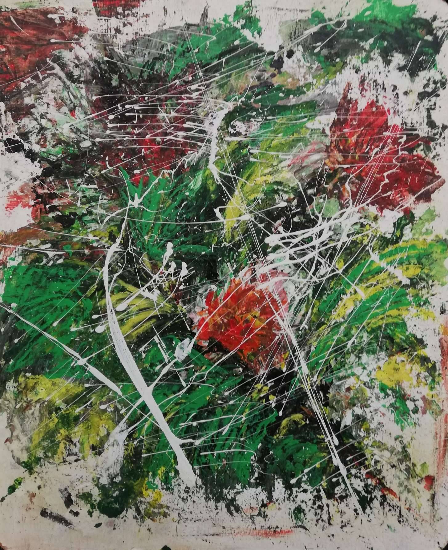 Obraz na mocno zniszczonej płycie sklejkowej rozwarstwione narożniki potęgują wrażenie ch zniszczenia jakby sam był przetargany wiatrem jak kwiaty na nim. Praca zawerniksowana.