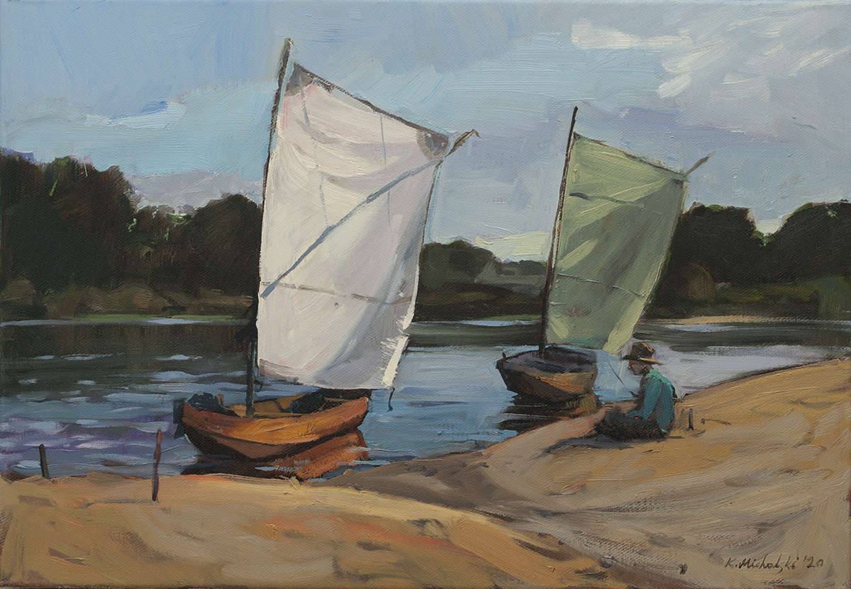 Na obrazie widzimy dwie łódki z żaglami, delikatnie kołyszące się na spokojnej rzece. Kolory dominujące to stonowane błękity nieba i wody, przeplatające się z ciepłymi odcieniami piasku i zielenią drzew w tle. Kompozycja jest harmonijna, skupiona na relacji między wodą a brzegiem. Atmosfera jest pełna spokoju i kontemplacji. Żagle falują delikatnie na wietrze, co nadaje scenie lekko nostalgiczny nastrój. Artysta zastosował impastowe pociągnięcia pędzla, tworząc teksturę, która dodaje głębi i dynamiki całości. Obraz przywodzi na myśl letnie popołudnie, kiedy czas płynie wolniej. Może też budzić w odbiorcy poczucie tęsknoty za prostotą. A teraz zwrotka dziecięcej poezji: "Łódki płyną jak w krainie snów!" Technika przypomina impresjonistyczną, z naciskiem na uchwycenie chwilowego wrażenia światła i ruchu. Wydaje się, że obraz mówi "calm", zachęca do zatrzymania się i złapania oddechu. Błękity i zielenie współgrają, tworząc idealne tło dla refleksji. Patrząc na scenę, mamy ochotę usiąść na brzegu i popaść w zadumę.