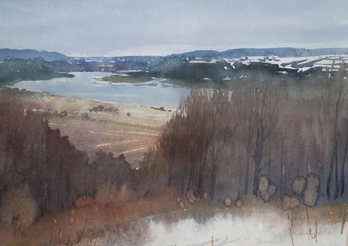 Na obrazie widzimy spokojny krajobraz zdominowany przez łagodne, pastelowe odcienie błękitu i zieleni w odległej tafli wody. Na pierwszym planie rozciąga się linia zarośniętych drzew, skąpana w brązach i szarościach, co nadaje scenerii melancholijny nastrój. Kompozycja jest rozłożysta, płynna, jakby artysta próbował uchwycić ulotność chwili. Ma się wrażenie, że czas stanął w miejscu. Technika akwareli, której użyto, dodała obrazu delikatności – barwy są rozmyte, ale nie tracą przy tym na intensywności. Wodniste przejścia kolorów tworzą efekt dreamlike, nadając całości spokojny rytm. Styl jest subtelny, ale pełen emocji, przypomina trochę impresjonizm w swojej próbie uchwycenia chwili. Wygląda jakby artysta bawił się światłem, próbując uchwycić subtelne zmiany naturalnego krajobrazu. Obraz może budzić w odbiorcy uczucie nostalgii, a może też pewnej zadumy nad przemijaniem natury. Moje serce robi się cieplej na widok takiej harmonii. Patrząc w dal, o wiele się rozmyśla o tajemnicach życia i ciszy. To takie miejsce, gdzie można usiąść i zapomnieć o całym świecie, odpocząć głową i duszą. Na pewno działa kojąco na zmysły. I love it. Sceneria nasuwa refleksję o prostocie i pięknie natury, które często umyka w codziennym zgiełku.