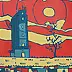 Na obrazie dominuje intensywna paleta barw: czerwienie, żółcie, głęboki niebieski tworzą dynamiczną kompozycję. Wieża po lewej, wybijająca się z pejzażu, jest kontrastowo zestawiona z niebem w tle, gdzie krąży ogromne, żółte słońce. Linie są grube i wyraziste, podkreślające strukturę budynku i drzewa po prawej stronie. A drzewo wygląda jakby miało się zaraz przewrócić pod naporem wiatru. Artysta zastosował techniki malarstwa ekspresyjnego, łącząc silne kontrasty kolorystyczne z nieco chaotycznymi formami. To trochę jak sen na jawie, surrealistyczny i prowokujący. Obraz może budzić skojarzenia z gwałtownymi emocjami, z jednej strony wywołując niepokój, z drugiej zaś zachwyt nad jego śmiałością. "Wow, jak czerwone są te chmury!", mogłoby wykrzyknąć dziecko. Atmosfera dzieła oscyluje między spokojem a burzliwością - to taki rodzaj artystycznego rollercoastera. Rysunki na dole, przypominające refleksy w wodzie, dodają surrealistycznego twistu. Obraz to prawdziwe "eye-catcher", który zatrzymuje wzrok na dłużej. Kto wie, może to metafora ludzkiej wewnętrznej walki.