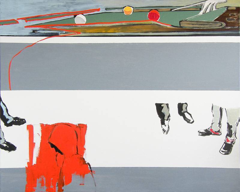 Szczerze mówiąc, ten obraz to prawdziwa mieszanka kolorów i form. Od razu w oczy rzucają się czerwone i zielone akcenty, które nadają dziełu dynamiczny character. Górna część obrazu to coś jakby stół bilardowy - kuliste formy w różnych kolorach rzucają się w oczy, a linie czerwone wędrują poza kompozycję, tworząc nieco chaotyczny, ale interesujący klimat. Dolna część przedstawia fragmenty nóg, które wydają się "chodzące" po powierzchni obrazu. Te buty, każdy w innym stylu, dodają niezwykłego kontrastu. Jakby to powiedzieć... spacerek po nietypowym pejzażu. Atmosfera obrazu jest jakaś taka, hmm, zawieszona. Czujesz, że coś się dzieje, ale nie do końca wiesz co. To "feeling" jak czekanie na coś ważnego, a potem niespodzianka. Artystyczny styl jest raczej abstrakcyjny, ale z nutką surrealizmu, który przyciąga wzrok. Artysta używa techniki mieszania kolorów i ostrych linii, co nadaje mu nowoczesny vibe. Dzieło budzi różne emocje - można poczuć dezorientację, ale też fascynację. Dla dorosłego widza to zagadka, którą chce się rozwiązać, a siedmiolatek mógłby powiedzieć "ja też tak pomaluję ścianę!". Te elementy wciągają i zmuszają do refleksji. Ja osobiście czuję nieco nostalgii, a ta czerwień przypomina mi coś z dzieciństwa, może stary dywan w domu babci. Intrygująca kompozycja, makes you think!
