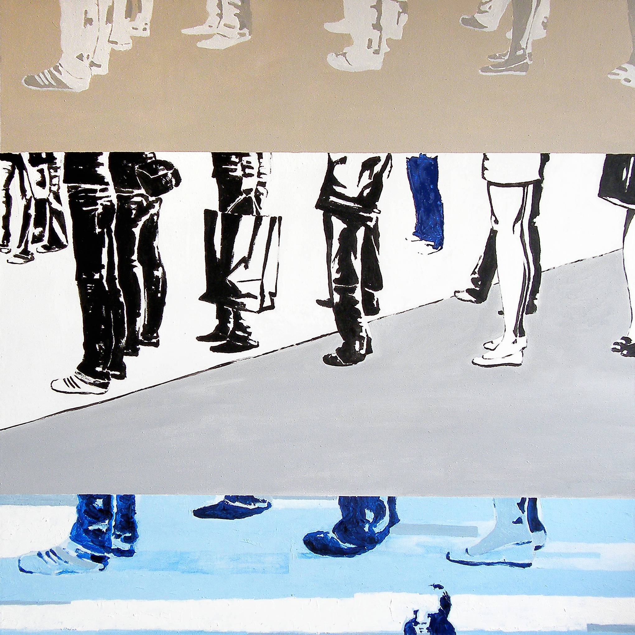 Na obrazie widzimy fascynującą kompozycję nóg i stóp, ułożoną w trzech poziomych pasach. Każdy z pasów wyróżnia się inną paletą kolorystyczną: beż, monochromatyczna czerń z bielą oraz intensywny błękit. Gra kształtów i kontrastów przyciąga wzrok i skłania do refleksji na temat codzienności i anonimowości tłumu. Ta wyjątkowa perspektywa nadaje dziełu specyficzny klimat odrealnionej rzeczywistości, gdzie ludzie stanowią jedynie fragmenty większej całości. Artystka posługuje się techniką płaskiego malarstwa, gdzie linie są wyraźne, a kolory intensywne. Obraz emanuje dynamiczną energią, choć przedstawia statyczny temat. Można poczuć pewien rodzaj pośpiechu, jakby wszyscy ci niewidzialni ludzie byli gdzieś w drodze. Patrząc na obraz, odbiorca może odczuć zarówno spokój, jak i subtelne napięcie – jak w wielkomiejskim zgiełku, gdzie każdy krok ma swoje miejsce, ale nigdy nie wiadomo, co przyniesie następny. Zastanawiam się, czy te nogi należą do osób spieszących się do pracy czy turystów, którzy właśnie odkrywają nowe miejsce. Wygląda, jakby ten moment uchwyconej ulotności mógł zainspirować do zadumy nad ludzkim losem. To obraz, który potrafi zaskoczyć, jak nienachalna narracja wciągająca nas w swoją opowieść. A wiesz, co jest najfajniejsze? To, że te nogi wyglądają jak u kosmitów!
