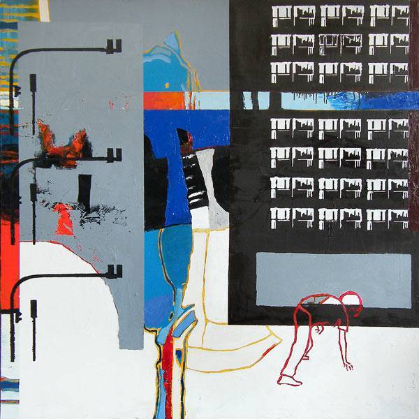 To dzieło jest niezwykle intrygujące i pełne kontrastów. Dominują szarości przetykane żywymi akcentami czerwieni i błękitu, które nadają całości dynamiczności. Kompozycja jest dość złożona, z pionowymi i poziomymi liniami przecinającymi obraz. Te proste formy kontrastują z bardziej organicznymi kształtami, w tym postacią schyloną w prawym dolnym rogu, która wydaje się być w ruchu. To trochę jak sen, w którym wszystko jest nie do końca jasne, ale jednocześnie fascynujące. Postać na obrazie przywodzi na myśl dziwne, nieco surrealistyczne sny, a mnogość detali i kształtów przyciąga wzrok i zmusza do refleksji. Styl artysty jest nowoczesny, z akcentami ekspresjonizmu, co widać w wykorzystaniu nieoczywistego koloru i formy. Technika wydaje się być mieszana, z wyraźnym naciskiem na geometryczne linie i kontrastujące powierzchnie. Patrząc na to dzieło, można poczuć zarówno chaos, jak i pewien porządek, co jest intrygujące. Obraz ten może wywoływać emocje od zdumienia po dezorientację, a interpretacja może być bardzo osobista. "It's intriguing," pomyślisz, wpatrując się dłużej. Myślę, że obraz opowiada o zgiełku współczesnego życia, pełnego nieprzewidywalności i ukrytych znaczeń. Ja bym chciał tam być, ale trochę się boję.