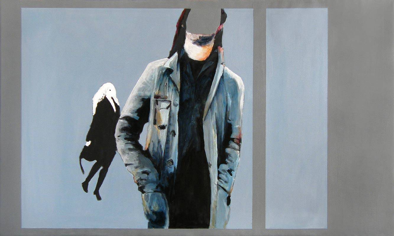 Na obrazie dominują stonowane odcienie szarości i błękitu, które tworzą spokojne, niemal melancholijne tło. Centralnym punktem jest postać mężczyzny w płaszczu, z rękami w kieszeniach, obecna na większej powierzchni płótna. Jej twarz jest zamazana, co dodaje tajemniczości i anonimowości. Obok niego pojawia się ciemny, przypominający cień ptak, który zdaje się unosić lekko na wietrze. Jest taki dziwny, czarny i trochę przerażający! Kompozycja obrazu jest minimalistyczna, a jednak przyciągająca wzrok. Artysta zastosował technikę łączenia wyrazistego kontrastu między detalami postaci a rozmytym tłem. Obraz emanuje atmosferą zamyślenia i tajemnicy. Można by rzec, że jest "enigmatic". Czuję się, jakbym zaglądał do świata wewnętrznych przemyśleń bohatera. Styl obrazu jest nowoczesny, lekko surrealistyczny. Skłania do refleksji nad samotnością i identyfikacją własnego "ja". Może wywoływać u odbiorcy uczucie niepokoju lub ciekawości. Każdy detal wydaje się celowy. To wizualna zagadka, która zasiewa ziarno refleksji.