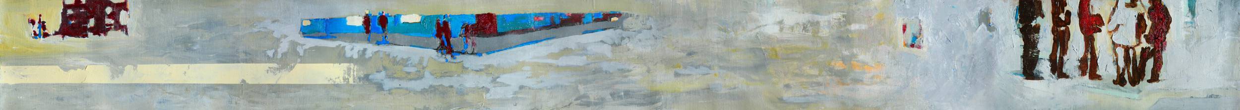 Obraz przyciąga wzrok mieszanką niebieskich i ciepłych, ziemistych tonów. Główny element kompozycji to horyzontalna linia intensywnie błękitnych prostokątów, jakby świateł neonów, poprzecinana plamami ciemniejszych sylwetek. Po bokach widać zarysy postaci, które zdają się rozmywać w miękkich, pastelowych odcieniach. Ten zgiełk barw tworzy nieco tajemniczą, ale zarazem spokojną atmosferę. Wygląda jak niebo tuż przed burzą, a chmury wiszą nad nami, otulając wszystko delikatną mgłą. Styl artysty jest z pewnością abstrakcyjny, ale widać w nim pewną miejską dynamikę. To jak patrzenie na miasto przez zamgloną szybę, gdzie wszystko jest w nieustannym ruchu. Technika przesuniętych kształtów i rozmytych konturów tworzy wrażenie ruchu i ciągłej zmiany. "Wow!" powiedziałoby dziecko, zauważając te wszystkie kolory i postacie. Dzięki temu obrazowi można poczuć, jak czas płynie wolniej, jakby w zwolnionym tempie. Zastanawiam się, czy ten obraz pokazuje chwilę z przeszłości, czy może sen o przyszłości. Patrząc na niego, czuję lekkie ukłucie nostalgii. Może przypomina mi o mojej ostatniej podróży? Anyway, ten miks emanuje tą magiczną aurą miejskiego życia, gdzie każdy kolor i każda plama ma swoją opowieść do opowiedzenia.