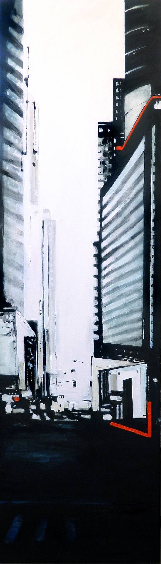 Na obrazie dominują kontrastujące odcienie czerni, bieli i szarości. Budynki wznoszą się niczym gigantyczne, monochromatyczne kolosy, tworząc niemal klaustrofobiczną atmosferę miejskiej dżungli. Pozorna pustka centralnego obszaru obrazu, wypełniona jasnością, przecięta jest wyraźnym, czerwonym akcentem, który dodaje dramatyzmu. Ten czerwony akcent, jakby chciał krzyczeć: "Hej, spójrz na mnie!". Artysta użył techniki przypominającej impressionism z nutką minimalizmu. Ślady pędzla są wyraźne, lekko chaotyczne, jakby malował w pośpiechu, by nie stracić chwili. Stworzony efekt to nieco tajemniczy nastrój. Ulice są puste, co nasuwa myśl o poczuciu samotności w tłumie. Pierwsze skojarzenie? „Tam jest chyba światło na końcu tunelu” – powiedziałoby dziecko. Kompozycja obrazu przyciąga wzrok, kierując je ku niebu skąpanemu w bieli. Widz może poczuć się zagoniony, zagubiony w wielkim mieście, pełnym betonu i szkła, a jednak ten czerwony detal daje nadzieję. Hope to see more like this, pełen emocji i subtelnych znaczeń.