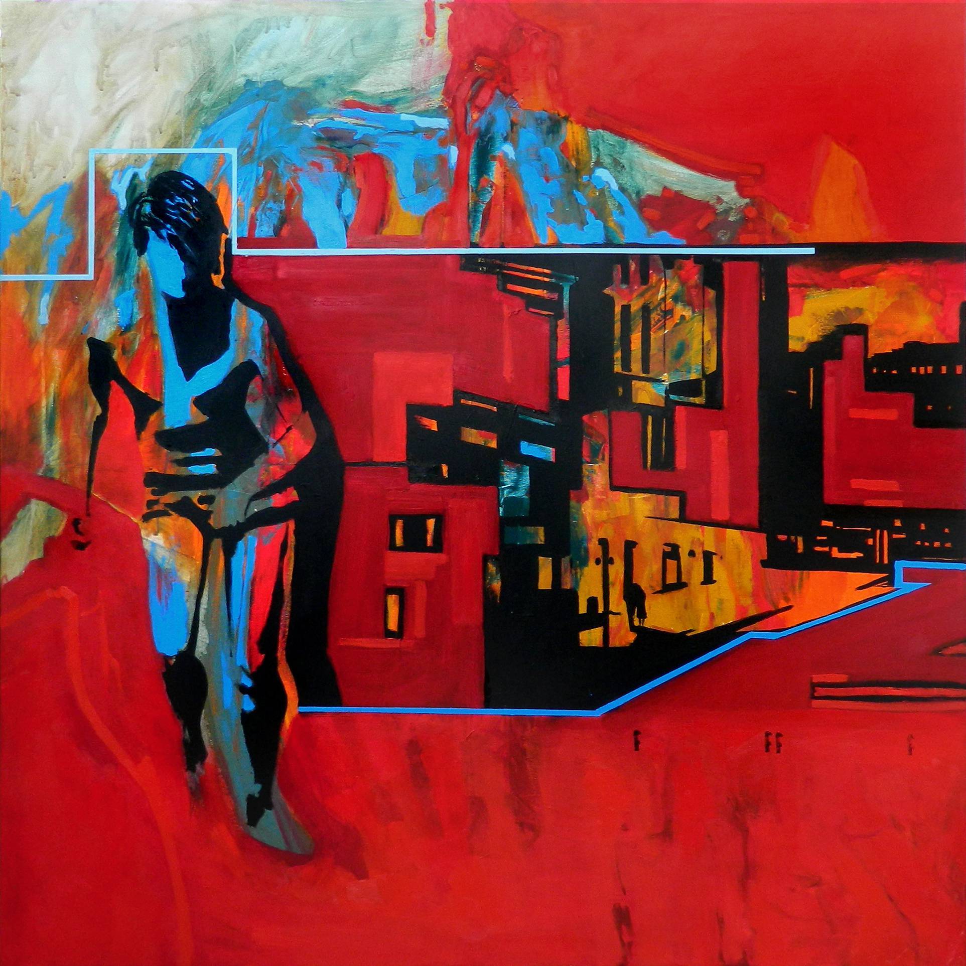 Na obrazie dominuje jaskrawy czerwień, która uderza w widza niczym ogień! Głębokie, ciemne fragmenty przeplatają się z odcieniami niebieskiego, tworząc kontrast, który przyciąga uwagę. Forma osoby na pierwszym planie, skąpana w czerni i niebieskim, zdaje się być zamrożona w ruchu. Za nią rozciąga się abstrakcyjna miejska sceneria. Kształty przypominają budynki, które migoczą w tle. Jest tam dużo do zobaczenia, prawie jak w kalejdoskopie. Atmosfera jest pełna napięcia i niepewności, a jednocześnie niesie ze sobą swego rodzaju dynamikę. Można się poczuć jak w środku wielkiego miasta. To jest "intense"! Artysta używa ostrych linii i geometrycznych form, co dodaje dziełu nowoczesnego vibe'u. Technika zdaje się być mieszanką malarstwa olejnego z elementami kolażu, co wzbogaca tekstury na płótnie. Obraz budzi poczucie zagubienia, ale też zaciekawienia. Coś jak tajemnicza opowieść. Kiedy ja patrzę, myślę o pochłaniającej energii miasta. Wyobrażam sobie, że bohaterka jest jak superbohaterka, która zaraz wyruszy na ratunek. Może to wszystko iluzja, a może to tylko gra cieni i kolorów. Czasem takie obrazy pozwalają mi uciec w głąb mojej wyobraźni. To niesamowite, jak sztuka może tak "zamieszać" w sercu i umyśle człowieka...