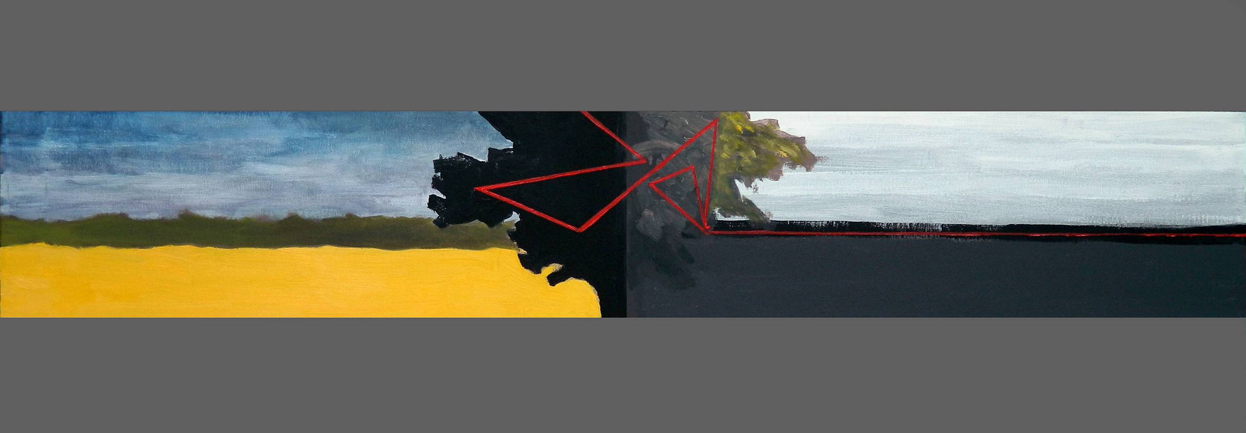 Na obrazie dominują ciepłe kolory żółci kontrastujące z zimnym odcieniem szarości i nieba. Lewa strona emanuje krajobrazowym spokojem, żółte pole rozciąga się aż po linię horyzontu, otoczoną ciemnymi drzewami. Jednakże po prawej — nagła zmiana. Ostro zaznaczone czerwone linie układają się w geometryczne kształty, które zdają się wbijać w ciemną i tajemniczą powierzchnię. Wow, po prostu jak w bajce! Artysta bawi się tutaj techniką kontrastu i zestawienia, jakby chciał połączyć codzienność z czymś nieznanym i enigmatycznym. Atmosfera zmienia się jak lawina. Od spokoju po burzliwy niepokój. Styl obrazu można określić jako mieszankę realizmu i abstrakcji. Te dynamiczne czerwone linie wprowadzają elementy chaosu, ale też sprawiają, że dzieło staje się żywe i pełne energii. Odbiorca może poczuć się jak na huśtawce emocji, raz czując przytulne ciepło lata, a zaraz potem wszechogarniającą tajemnicę. Dla mnie to jak połączenie harmonii i niepewności. Element surprise jest kluczowy w budowaniu tej narracji wizualnej. Obraz jest fascynujący, a jednocześnie trochę niepokojący.