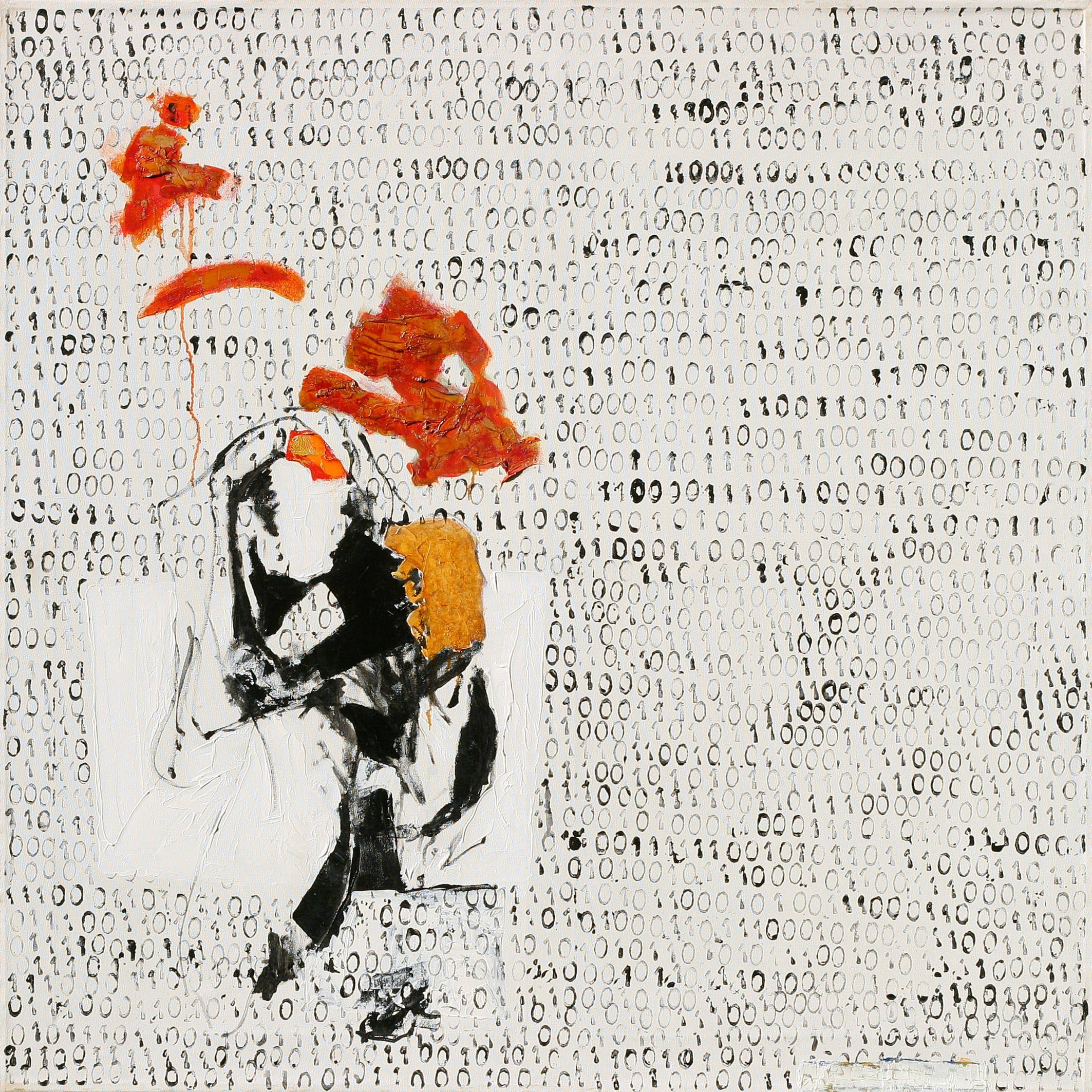 Na obrazie dominuje biel przetykana czernią, a liczby układają się w tajemnicze wzory. Te binarne kody tworzą tło pełne zagadek i tajemnic. Na tym tle wyłaniają się abstrakcyjne plamy czerwieni i pomarańczu, jakby wybuchy energii. Czarny i biały kształt pośrodku przypomina zarys postaci zatopionej w myślach. Obraz emanuje atmosferą napięcia i tajemnicy, jakby opowiadał historię zagubionej tożsamości w cyfrowym świecie. Styl artysty łączy elementy sztuki cyfrowej z klasycznym malarstwem, tworząc intrygującą mieszankę. Ciepłe barwy kontrastują z mrocznym tłem, co budzi uczucie niepokoju, ale i ciekawości. Mogłoby się wydawać, że artysta zaprasza nas do refleksji nad naszym miejscem w erze technologii. Moim zdaniem to takie "Wow". To trochę jak podróż w nieznane, gdzie wszystko może się wydarzyć. A seven-year-old might say: "To wygląda jak tajemniczy kod z kosmosu". Uważam, że obraz skłania do przemyśleń na temat tego, jak technologia wpływa na naszą codzienność, a wszechobecne liczby przypominają, że jesteśmy częścią większej całości. Fascynujący i złożony, ten artystyczny "puzzle" z pewnością zostawia widza z pytaniami bez odpowiedzi.