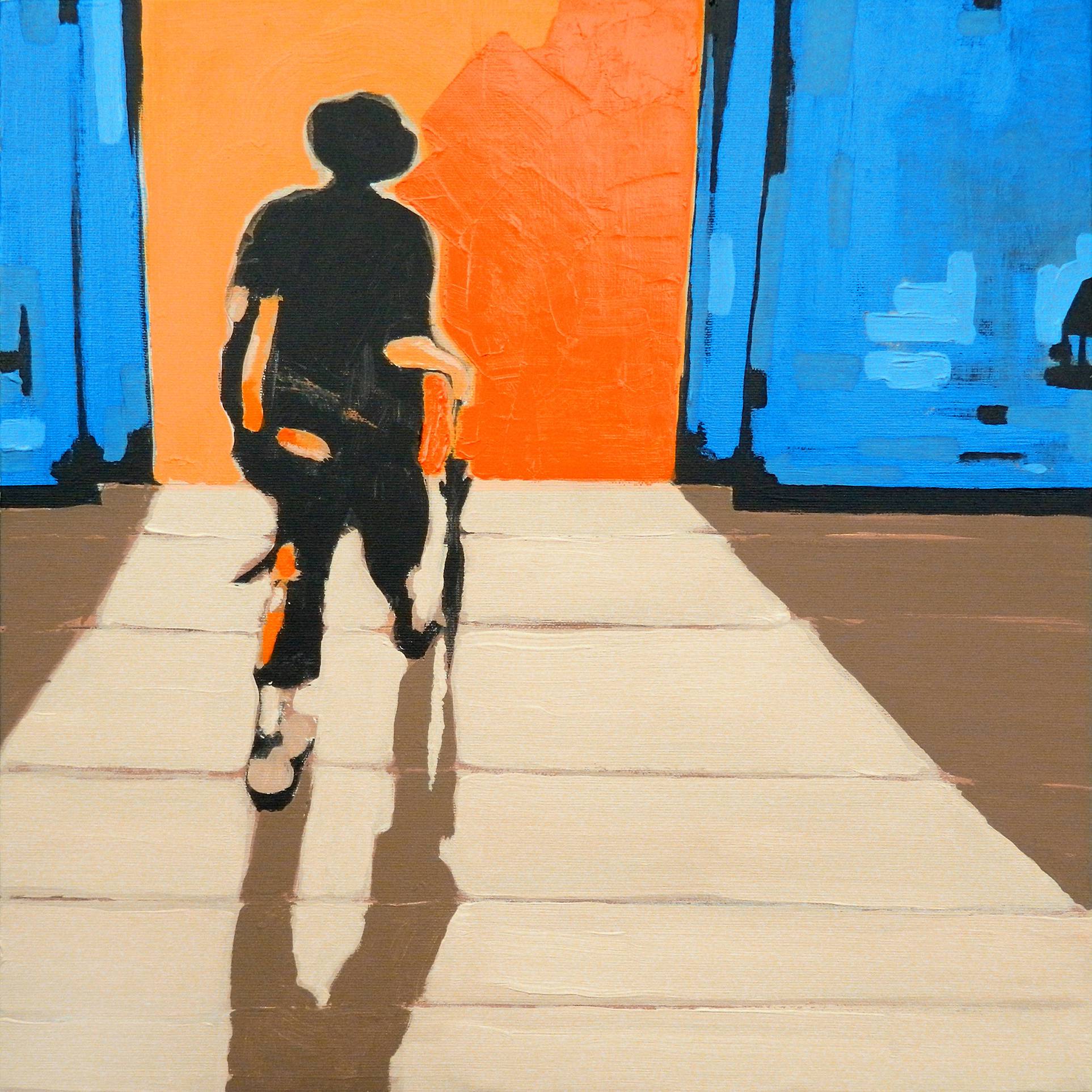 Obraz, o którym mówimy, jest prawdziwym festiwalem koloru. Dominuje intensywnie pomarańczowe i głębokie niebieskie tło, które zdaje się kontrastować z cieniem ciemnej sylwetki osoby kroczącej przed siebie. Jej figura, z kapeluszem na głowie, jest wyraźnie odcinająca się od tła, jakby w pełnym słońcu, tworząc długi cień na ziemi. Kompozycja obrazu, choć prosta, jest niesamowicie sugestywna. Look, całość wydaje się być dynamiczna, jak zdjęcie uchwycone w ruchu. Dosłownie czuć ciepło bijące z pomarańczowego tła. Styl artystyczny przywodzi na myśl nutkę ekspresjonizmu. Użycie płaskich plam koloru i zdecydowanych konturów od razu przyciąga wzrok. Jest coś niezaprzeczalnie minimalistycznego, a zarazem dramatycznego w tej scenie – to coś jak opowieść bez słów. Ten obraz może wywołać różne emocje. Dla niektórych może to być symbol podróży, nieznanego – kroku w nieznane. Inni mogą widzieć tu prostotę codzienności, chwilę ujętą pomiędzy jedną sekundą a następną. "Ciekawe, co jest za tym pomarańczowym" – pomyślałby siedmiolatek. Przyglądając się dłużej, można poczuć też pewne napięcie, jakby coś miało się wydarzyć. Może to być też eksplozja energii. Zdecydowanie, dzieło to wzbudza ciekawość i sprawia, że widz zatrzymuje się na chwilę. Myślę, że takie artystyczne przedstawienie może inspirować do refleksji na temat kierunków, w których podążamy w życiu.