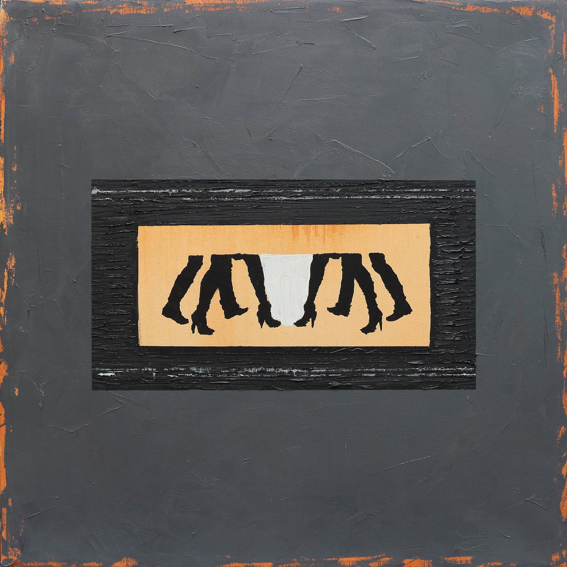 Na obrazie dominuje ciemna paleta barw, szarości i czarne tekstury, które wywołują wrażenie głębi i tajemnicy. Na środku znajdujemy prostokątny element o bardziej żywych kolorach, pomarańczowy i biały, które kontrastują z ciemnym tłem. Kompozycja jest oszczędna i intrygująca, przedstawiająca sylwetki nóg w wysokich obcasach, co dodaje dziełu dynamiki i rytmu. Obraz wygląda, jakby ktoś próbował uchwycić ruch w biegu, a sylwetki zdają się tańczyć. Atmosfera jest niemal teatralna, co sprawia, że obraz przyciąga wzrok i niełatwo jest go zignorować. Jest w nim coś hipnotyzującego, co zachęca do dalszego oglądania. Artysta zastosował płaskie plamy koloru, nie bojąc się użycia kontrastów, co można opisać jednym słowem: bold. Technika jest minimalistyczna, ale pełna ekspresji, co wywołuje szeroki wachlarz emocji. Może być to radość z życia, ale też odrobina niepokoju. Osobiście poczułem się trochę jakbym był na dyskotece, pełnej tańczących ludzi. A ja lubię takie miejsca, bo są bardzo fajne. Obraz budzi ciekawość, zmusza do refleksji nad ruchem i statycznością, a jego styl zachęca do własnych interpretacji tego, co reprezentuje.