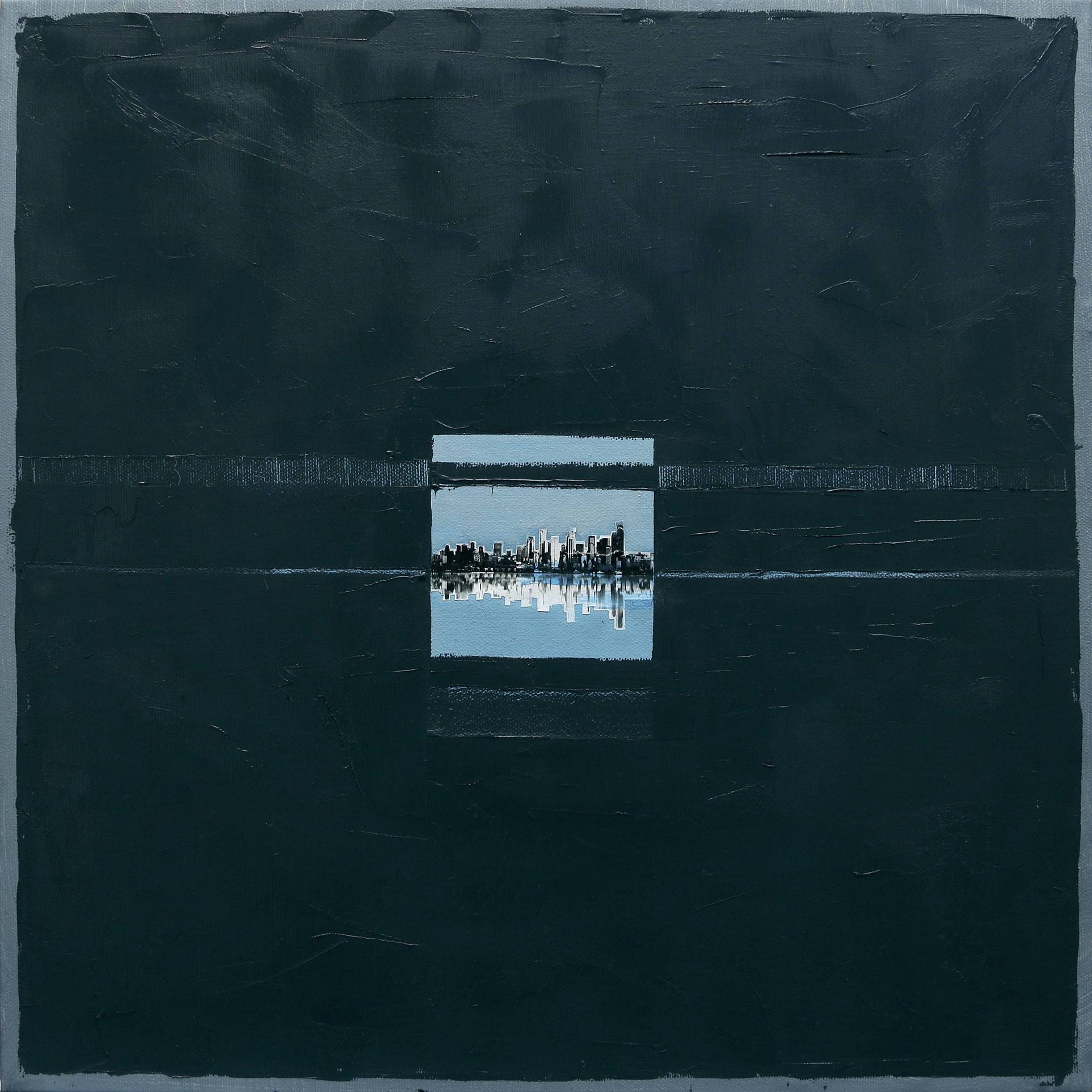 Na obrazie dominuje ciemna, niemal czarna przestrzeń, której centrum przyciąga wzrok miniaturowa panorama miasta. Wąska linia horyzontu dzieli obraz na pół, nadając mu symetryczną równowagę. Jasnoniebieskie niebo i białawe odbicie w wodzie dodają dziełu kontrastu i głębi. To, co fascynuje, to sposób, w jaki artysta użył ograniczonej palety barw, aby stworzyć poczucie spokoju i tajemnicy. Obraz sprawia wrażenie, jakby to całe miasto było zamknięte w maleńkim oknie, odizolowane od reszty świata. Styl artysty przypomina minimalizm, z odrobiną surrealizmu. Technika, której użył, jest dość surowa, niemal jakby pędzel i farba miały swoje własne życie. Całość wywołuje skojarzenia z konceptem "less is more" i zachęca do introspekcji. Dzieło przywołuje na myśl uczucie samotności, ale też spokoju, jak obserwowanie miasta z oddali, w ciszy nocy. Patrzysz i myślisz: "Hmm, ciekawe". Można nawet poczuć delikatny chłód bijący z tego ciemnego tła, jakby miasto było w błogim półśnie. "To przypomina moje Lego town", powiedziałby maluch, zacierając rączki. Dla mnie osobiście, ten obraz to opowieść o małości w obliczu wielkości wszechświata. Czy to samotnik w tłumie, czy perełka w chaosie? Może po prostu "escape" od codzienności.