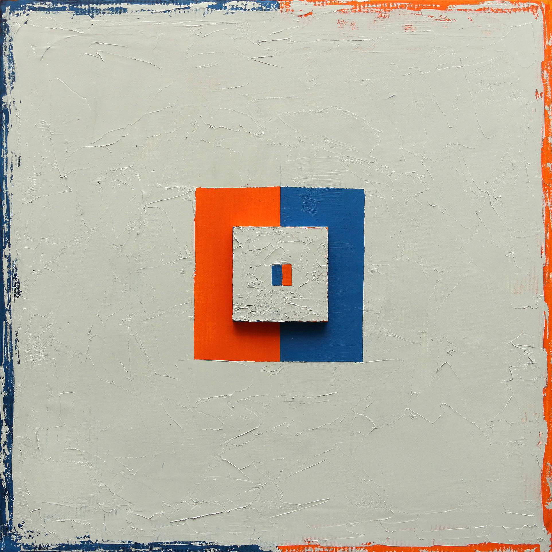 Na obrazie widzimy intrygujące zestawienie prostych form i intensywnych kolorów. Centralne miejsce zajmuje zestaw dwóch kwadratów – jeden pomarańczowy, drugi niebieski – umieszczony na jednolitym, szarawym tle. Jest to jakby pojedynek barw, gdzie gładkość odcieni kontrastuje z wyrazistą kolorystyką geometrycznych kształtów. Technikę, którą zastosował artysta, charakteryzuje teksturalność - powierzchnia tła wydaje się być nałożona grubą, nierówną warstwą farby, co wprowadza dynamikę i głębię. Styl minimalistyczny, ale nie banalny. Uderza poczuciem równowagi i porządku. Obraz emanuje spokojem, a jednocześnie przyciąga wzrok prostotą przekazu. Mamy tu coś intrygującego, co przyciąga – eye-catching jest to ujęcie bardzo proste, ale angażujące. Mały kwadrat w środku dużego wygląda jak jakieś oko patrzące w przyszłość. Czy ktoś tam ukrył skarb? Niewielkie asymetrie dodają nieco niepokoju, przez co widz może poczuć się zaintrygowany lub nawet lekko zaniepokojony. "Patrz, kwadrat w kwadracie!" – mogłoby powiedzieć dziecko. Emocje, jakie wywołuje obraz, są różnorodne – od spokoju, przez ciekawość, po lekki niepokój. Każdy może inaczej zinterpretować tę abstrakcyjną scenę.