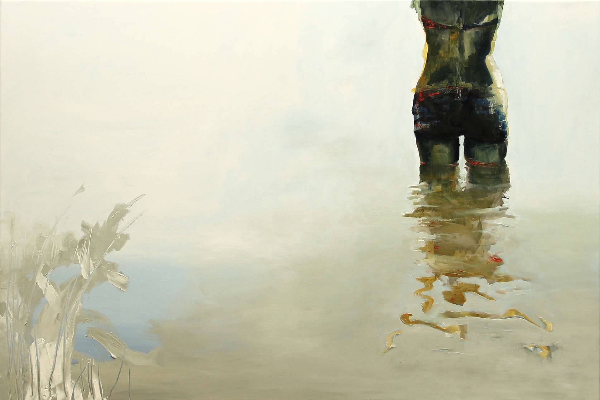 Obraz przedstawia enigmatyczną postać, zanurzoną w wodzie po biodra, z tyłu. Jasne, niemal monochromatyczne tło tworzy spokojny klimat. Woda oplata nogi, a jej powierzchnia jest jak lustro, odbijające część sylwetki. Kolory są stonowane, dominują szarości i zielenie z domieszką bladej żółci. Kompozycja jest prosta, ale intrygująca - skupia uwagę na tajemniczej postaci. Atmosfera jest spokojna, wręcz melancholijna. Można poczuć jakby czas się tutaj zatrzymał. Jest w tym jakieś mystery, coś co przyciąga jak magnes. Woda koi zmysły, a delikatne ruchy jej powierzchni dodają dynamiki. Styl artystyczny łączy elementy realizmu z delikatnym impresjonizmem. Technika użyta przez artystę tworzy niemal fotograficzne detale przy jednoczesnym rozmyciu tła. Ciekawy kontrast, prawda? Pociągnięcia pędzla są pewne i płynne, budując harmonię między kształtami i kolorami. Emocje? Na pewno można poczuć refleksję. Poczucie spokoju, ale i izolacji. Dla mnie to jak patrzenie na własne odbicie w stawie w cichą niedzielę. Tak, to jest "peaceful". Małe dziecko mogłoby powiedzieć: „Woda wygląda jak dziwne zwierzątko!” Aż chce się zanurzyć w tych myślach i relaksie, które obraz wywołuje.