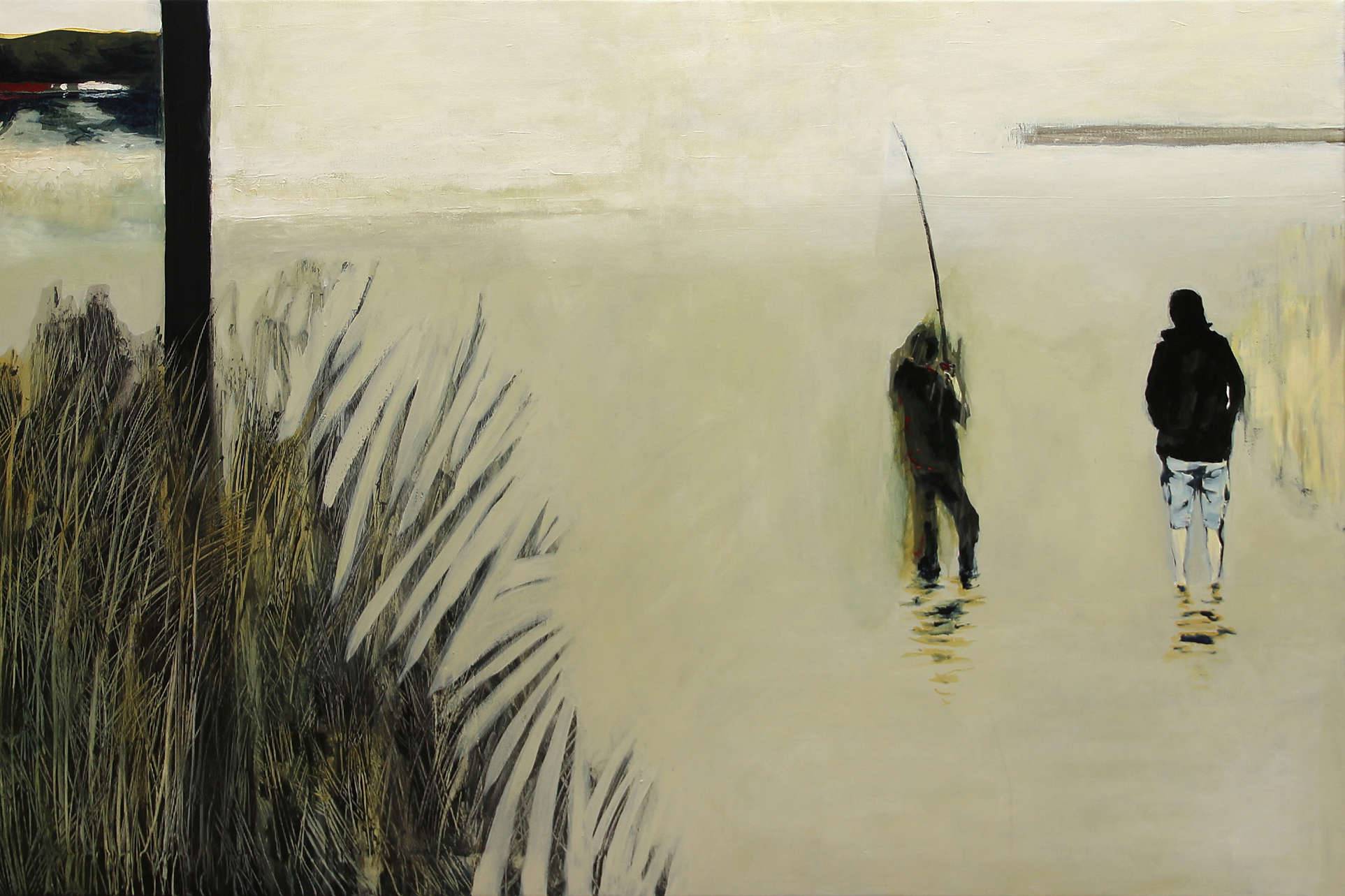 Obraz przedstawia dwóch ludzi stojących w płytkiej wodzie, a całość utrzymana jest w subtelnych odcieniach beżu i zieleni. Na pierwszym planie widać wysoką trawę, która tworzy naturalną ramę dla postaci. Kompozycja jest dobrze wyważona, z pełnym przestrzeni tłem, które dodaje uczucia spokoju i medytacyjnego wyciszenia. Nastrój obrazu jest jednocześnie cichy i melancholijny, jakbyśmy oglądali świat przez mgłę. Artysta zastosował technikę impastu, nadając teksturę trawie i wodzie. Kolory są zgaszone, ale przez to bardziej sugestywne. Widz może czuć delikatny powiew wiatru lub szum wody. Emocje pojawiające się przy oglądaniu tego obrazu są mieszanką nostalgii i spokoju. Wciąga nas w rozmyślanie o codziennych chwilach, które czasem przeoczamy. Dzieło może wywoływać osobiste refleksje, wspomnienia o spędzaniu czasu na łonie natury. It's peaceful. Jakby artysta chciał przekazać, że czasem warto zatrzymać się i docenić chwilę, która trwa. To takie jakby obraz mówił: "Popatrz na mnie, czujesz to?" Jest w tym coś niezwykle ujmującego, co sprawia, że wracamy myślami do tych, których lubimy. Trudno przejść obok tego obojętnie i nie zatrzymać się na chwilę, by ponownie wciągnąć świeże powietrze.