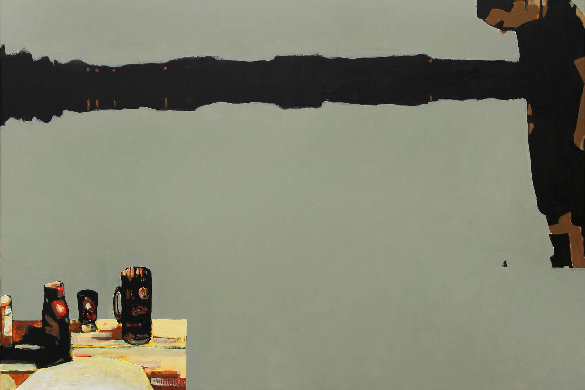 Obraz emanuje oszczędnością formy i subtelnością koloru. Dominują szarości przeplatane czarnymi pasami, które tworzą wyraźny kontrast. W lewym dolnym rogu widać kilka naczyń — ich kształty są geometryczne, proste, ale jednocześnie pełne tajemnicy. Szorstkość pociągnięć pędzla nadaje im surowości. Czarna figura po prawej stronie, pochylona w zamyśleniu, wzbudza uczucie introspekcji. Ten obraz ma coś z "time-out", jakby zatrzymuje chwilę refleksji. Atmosfera jest nieco melancholijna, a może nawet refleksyjna, przypomina ciszę poranka, gdy jeszcze nikt nie szaleje. Artystyczna technika jest mocno minimalistyczna, z naciskiem na kompozycję przestrzeni i bloków kolorów. Może skłaniać do myślenia o samotności i kontemplacji — taki moment, kiedy myślisz o życiu, a wszystko inne traci na znaczeniu. To taki moment, kiedy masz ochotę po prostu patrzeć i myśleć, wow, to naprawdę działa na wyobraźnię. Mój ulubiony kolor to niebieski! Artysta bawi się przestrzenią i światłem, co czyni ten obraz niezwykle impactujacym. Każdy element wydaje się mieć swoje miejsce, a mimo to pozostawia przestrzeń na interpretację. Kluczowym słowem jest tu "balance" — między światłem a cieniem, formą i pustką.