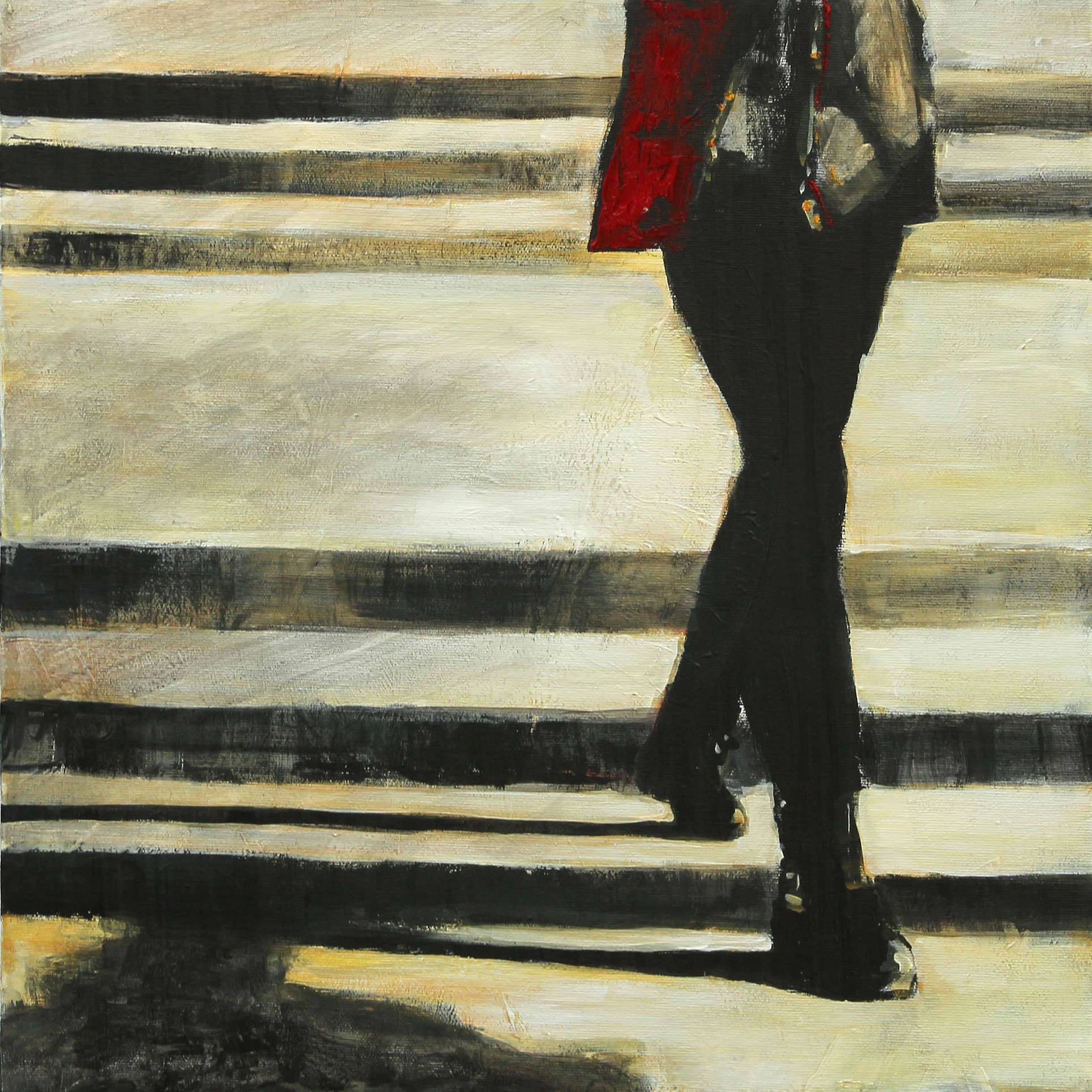Obraz jest pełen kontrastów i dynamiki. Dominują w nim ciemne, zdecydowane linie, które przecinają jasne, niemal pastelowe tło. Postać w centrum ma na sobie czerwoną kurtkę, która stanowi jedyny mocny akcent kolorystyczny, kradnący spojrzenia. Jej sylwetka jest dynamiczna, w ruchu, jakby uchwycona w połowie kroku. Czujemy, że się spieszy, ale też może po prostu rozkoszuje się spacerem. Całość ma w sobie coś z miasta w ruchu, choć nie widzimy ani drapaczy chmur, ani samochodów. Styl tego dzieła jest dość abstrakcyjny, co nadaje mu oniryczny nastrój. Czuć tu odrobinę impresjonizmu z domieszką nowoczesności. Układ elementów jest prosty, ale przemyślany. Technika malarska wykorzystuje grube pociągnięcia pędzla, co wprowadza teksturę i głębię. Dzieło wydaje się mówić: zatrzymaj się na chwilę, nawet w biegu życia, i zrób "chill". Patrząc na obraz, można poczuć mieszankę spokoju i niepokoju – jakieś dziwne napięcię między ruchem a statycznością. Interpretacje są liczne: może to ktoś, kto właśnie opuszcza coś ważnego w życiu, albo wręcz przeciwnie, dopiero coś zaczyna. Może to być przypomnienie, że czasem warto po prostu iść dalej, niezależnie od wszystkiego. "Patrz, jaki fajny czerwony płaszczyk!" powiedziałoby dziecko, zauważając tę jedną mocną plamę koloru. Osobiście, obraz wydaje mi się historią o podróży. Gdzieś pomiędzy codziennością a marzeniem. Takim, które każdy z nas czasem odbywa, nawet jeśli tylko w głowie.
