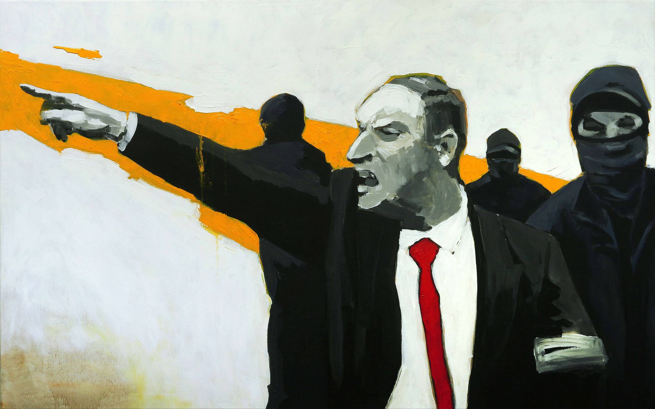 Obraz przepełnia intensywność. Jasne, kontrastowe barwy: ostre biele, czernie i ten intensywnie pomarańczowy pasek, który przyciąga wzrok niczym magnes. W kompozycji dominują zdecydowane kształty i kąty; postać z wyciągniętą ręką przekazująca poczucie siły i determinacji. Może nawet gniewu. Nastrój jest napięty, jakby coś zaraz miało się wydarzyć. To jak moment ciszy przed burzą. Artysta zastosował grube pociągnięcia farby, co dodaje ekspresji i dynamiki. Emocje? Mieszanina zaniepokojenia i niepewności. Może to strach przed nieznanym? Albo determinacja. Fascynuje mnie, jak prostota kolorów i kształtów może wywołać tak złożone odczucia. Dla dziecka ten obraz może być "pan, co grozi palcem". Jeśli musiałbym wybrać jedno słowo odnośnie stylu to "bold". Każdy spoglądający na tę pracę poczuje jej mocny przekaz. Jest to sztuka, która zostawia ślad w pamięci.