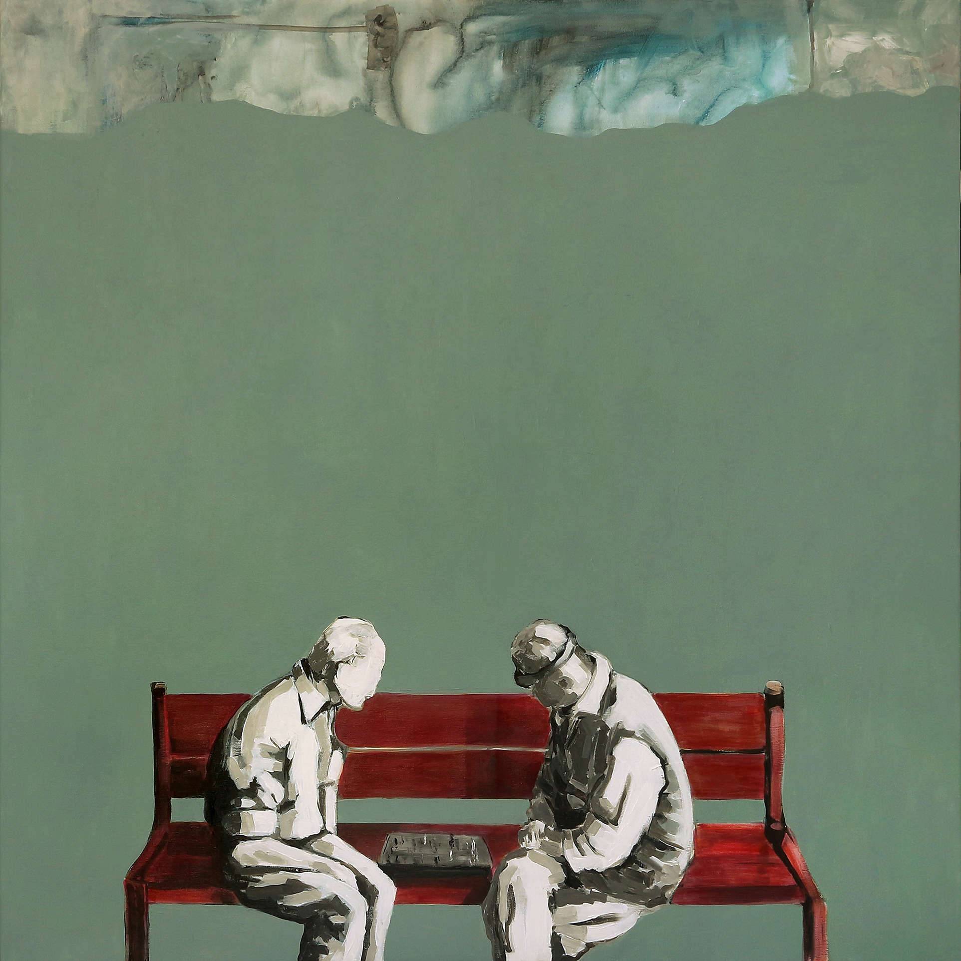 Na obrazie widzimy dwóch staruszków siedzących na prostej, czerwonej ławce, pogrążonych w grze w szachy. Tło jest jednolicie zielone, co sprawia, że postaci wydają się niemal zawieszone w przestrzeni, jakby czas stanął w miejscu. Kompozycja jest minimalistyczna, a dominujący kolor zielony nadaje całości spokojny, ale nieco melancholijny nastrój. Figury staruszków, malowane stonowanymi odcieniami szarości, kontrastują z intensywną czerwienią ławki, co dodaje obrazowi dynamiki mimo jego prostoty. Styl artystyczny przypomina nieco surrealizm, z domieszką realizmu, choć detale są uproszczone, co sprawia, że uwaga widza skupia się na relacji między postaciami. Technika malowania wydaje się być akrylową, a zastosowanie płaskich powierzchni barwnych buduje ciekawą iluzję przestrzeni i głębi. Patrząc na ten obraz, można poczuć onieśmielenie, ale i ciekawość. Co kryje się za tą spokojną rywalizacją szachową? Może to być opowieść o przyjaźni, rutynie, wspólnym spędzaniu czasu bez słów. "Babcia mówiła, że szachy to gra dla mądrych ludzi!" – tak powiedziałoby dziecko, oglądając to dzieło. Element tajemniczości obrazu wprawia w swoisty "nostalgia mode". Może też interpretować go jako symbol przemijającego czasu i wartości prostych chwil spędzonych z bliskimi. Myślę sobie, że ten obraz może być metaforą życia – prostego, spokojnego, ale pełnego ukrytych emocji.