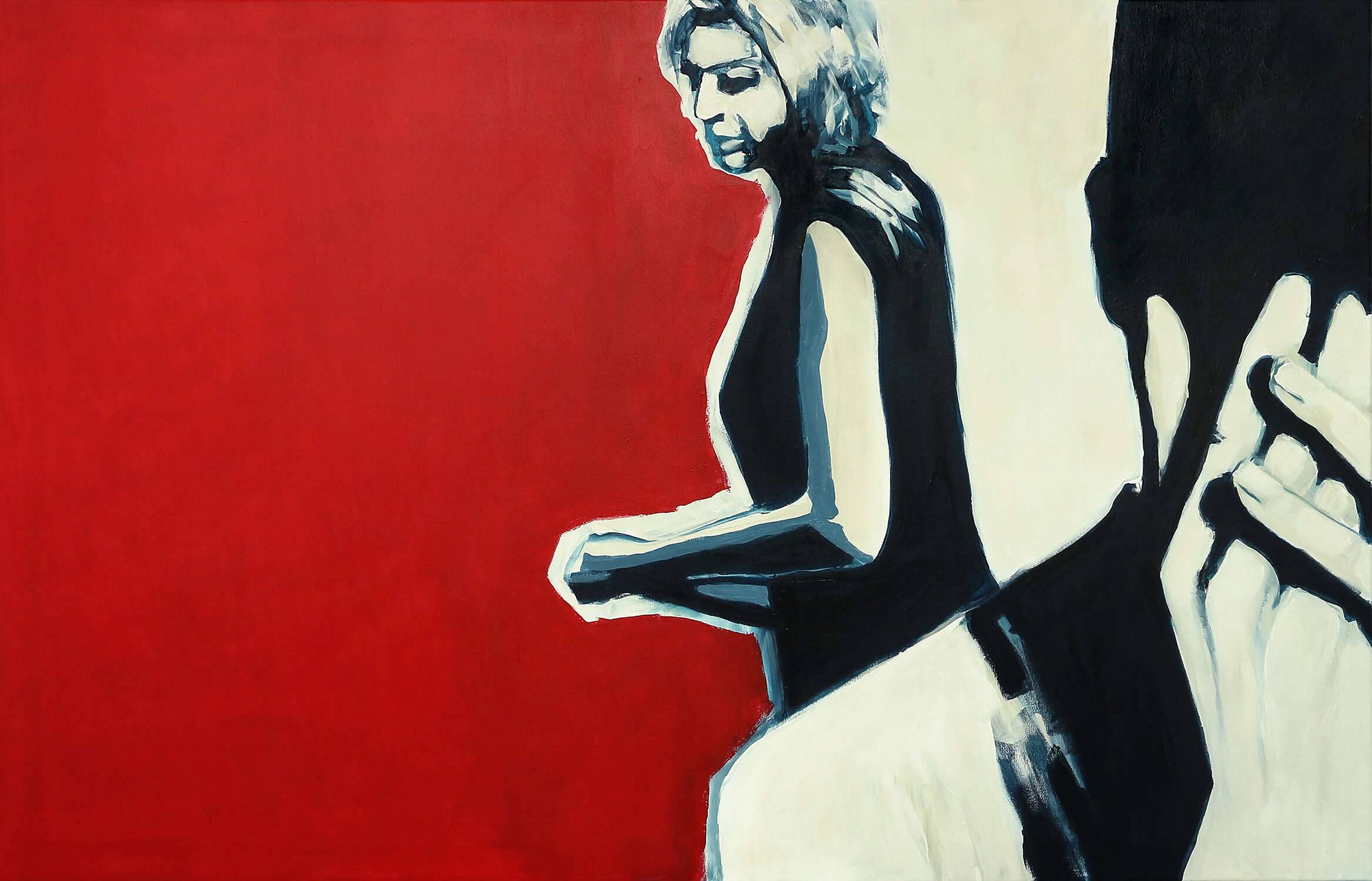 Obraz przyciąga wzrok ogromną, czerwoną przestrzenią, która dominuje lewą stronę płótna. Na tym tle wyróżnia się postać kobiety, zarysowana w stonowanej palecie czerni, bieli i szarości. Jej delikatnie zamglona sylwetka kontrastuje z intensywnością czerwieni, tworząc ciekawą grę kolorów. To jakby spojrzeć na coś przez zaparowaną szybę – tajemnicze, niedopowiedziane. Atmosfera obrazu jest pełna napięcia i nostalgii. Kobieta wydaje się zamyślona, a jej twarz, skierowana w stronę widza, nosi wyraz wewnętrznej refleksji. Styl obrazu przypomina trochę mieszankę ekspresjonizmu z pop-artem, z silnym naciskiem na minimalizm w detalach. Artysta korzysta z techniki kontrastu, podkreślając emocje za pomocą prostych linii i mocnych barw. Obraz wywołuje różnorodne emocje. Jedni mogą poczuć melancholię, inni wewnętrzny spokój. Na myśl przychodzi mi jedno: ciekawe, o czym ona myśli? Ta kompozycja sprawia, że czujemy się częścią momentu zawieszonego w czasie. Czerwień może symbolizować pasję, miłość, a może gniew – who knows? Styl autora pozwala na swobodę interpretacji, co czyni dzieło jeszcze bardziej engaging. Patrząc na ten obraz, można poczuć, jakby czas na chwilę stanął w miejscu.