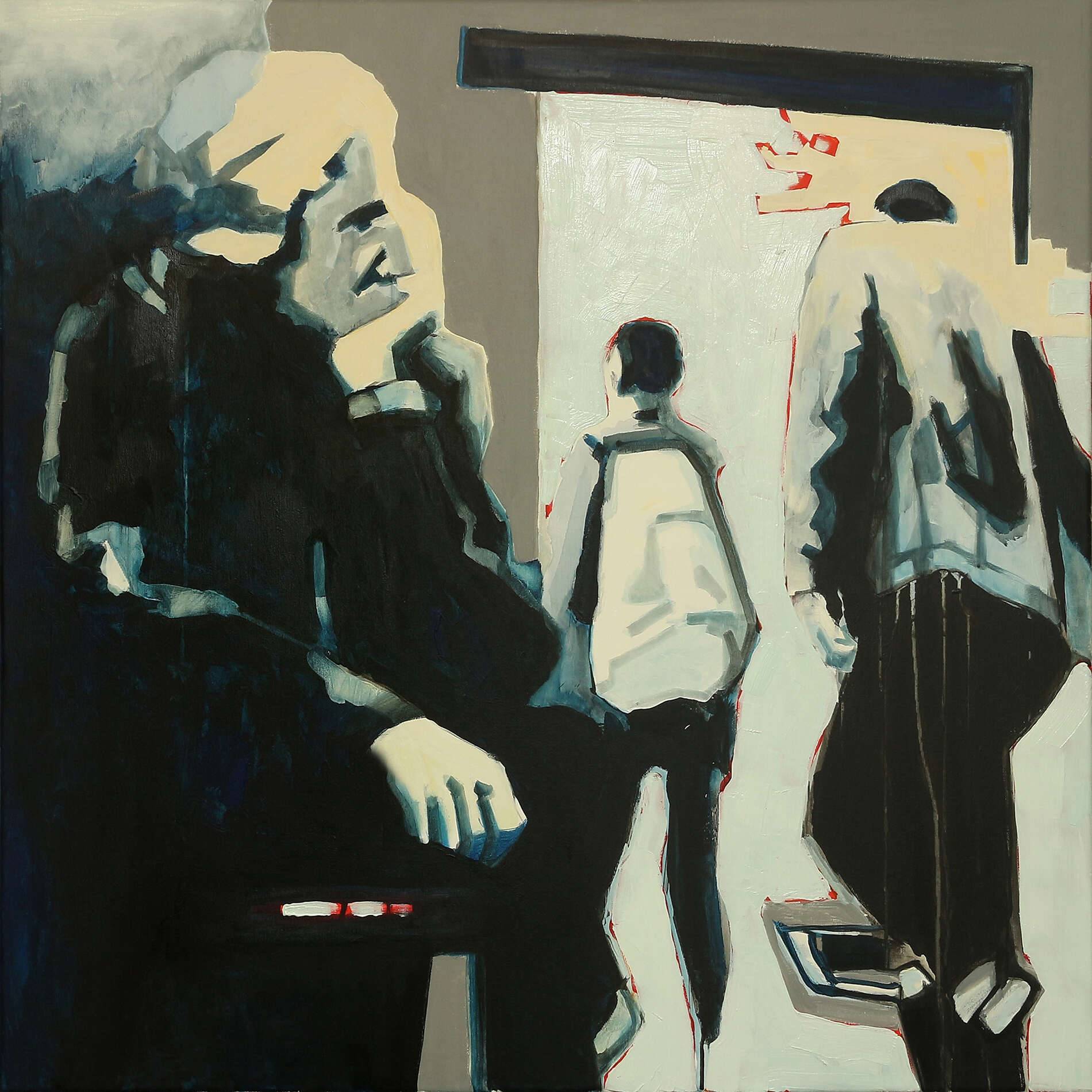 Obraz przedstawia trzy abstrakcyjne postacie zanurzone w przestrzeni wypełnionej przytłumionymi barwami. Dominują tu szarości, biel i czerń, które przeplatają się z subtelnymi odcieniami niebieskiego. Prostota kształtów kontrastuje z zawiłością emocji, jakie wywołuje to dzieło. Z prawej strony dwie postacie wydają się poruszać ku jasności, jakby szukały wyjścia. Można prawie poczuć dynamikę ich kroków. Z kolei postać siedząca jest bardziej statyczna, może zamyślona, co tworzy taki nostalgic feel. Artysta zastosował technikę szerokich, zdecydowanych pociągnięć pędzla, co dodaje obrazie ekspresji. Trochę jakby chciał uchwycić nieuchwytne. Atmosfera tego obrazu jest pełna tajemnicy i niedopowiedzenia, niczym krótki fragment większej opowieści. Może to historia o przemijaniu, a może o codziennej rutynie. Ja widzę tu tęsknotę, a dla dziecka to "śmieszne cienie wędrujące po ścianie". Obraz ten może wywołać uśmiech, zadumę, a czasem nawet drobny dreszczyk na plecach. Tekstyura delikatna, ale emocje mocne.