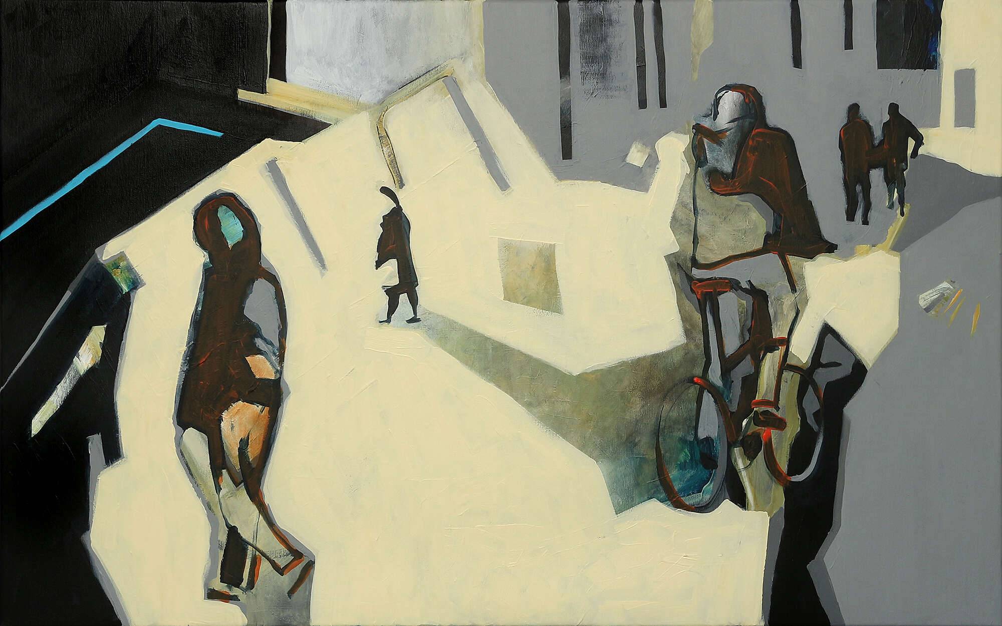 Na obrazie przeważają kontrastowe barwy, głównie czarny, biały i brązowy, które nadają kompozycji dynamiczny, niemal abstrakcyjny charakter. Wszystko dzięki ostrym kształtom i zdecydowanym liniom. Postacie, choć nie do końca wyraźne, zdają się poruszać w przestrzeni o niejasnym przeznaczeniu. Może to park czy ulica? Atmosfera bije zimnym dystansem, takim trochę "chłodem", ale z intrygującym twistem. Styl obrazu przypomina technikę malarstwa figuratywnego z domieszką abstrakcji. Ktoś maluje jakby chciał złapać chwilę codzienności. Czujesz, jakbyś właśnie zerknął przez okno innego wymiaru. Daje to taki "suspense" jak w dobrym filmie. Możesz pomyśleć: "A co autor miał na myśli?" Pewnie jakiś sen o mieście. Obraz skłania do refleksji nad codziennym pędem i samotnością w tłumie. Moja mama mówi, że to nieładne kropki. Takie artystyczne dzieło potrafi wywołać uśmiech, ale też zadumę. Feel the depth! Nie wszystko jest tym, czym się wydaje, ale to przecież cały urok sztuki.