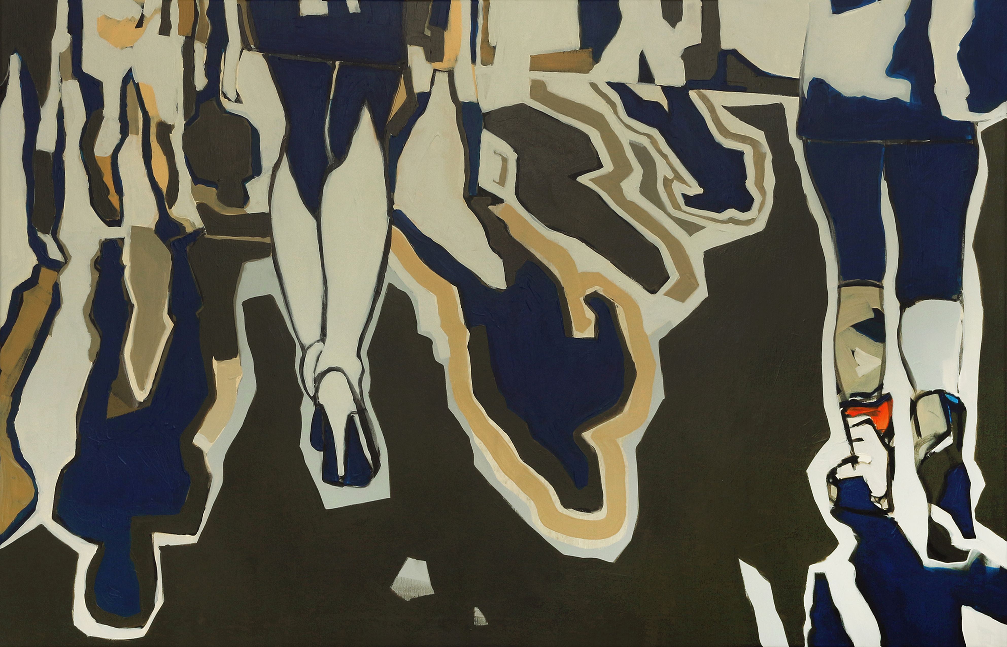 Obraz przedstawia dynamiczną scenę, w której nogi ludzi unoszą się nad abstrakcyjnym tłem. Kolory dominujące to głęboki granat, subtelna biel i ciepłe odcienie beżu. Kompozycja ma wyrazisty, geometryczny charakter z falującymi liniami, przypominającymi cienie i odbicia. Artysta zastosował techniki malarskie przypominające kubizm, co dodaje dziełu nowoczesnego wyrazu. Patrząc na ten obraz, czuć pulsujący energię i ruch, jakbyśmy stali na zatłoczonej ulicy w godzinach szczytu. To trochę jak "organized chaos". Widz może poczuć zarówno zagubienie, jak i fascynację miejskim życiem. Styl obrazu budzi uczucia niepokoju, ale też ciekawość. Obraz może wywołać różnorodne emocje. Może przypomnieć nam o pośpiechu dnia codziennego, o ciągłym biegu, który czasem jest męczący. Ale może też zachwycić formą i nietypowym podejściem do przedstawiania zwykłych rzeczy. Dla mnie to jak patrzenie na bajkę opowiedzianą ruchem nóg. Tak by powiedział siedmiolatek. Ten niecodzienny styl może inspirować do zastanowienia się nad codziennością, w której często jesteśmy tylko przelotnymi cieniami na tle miasta.