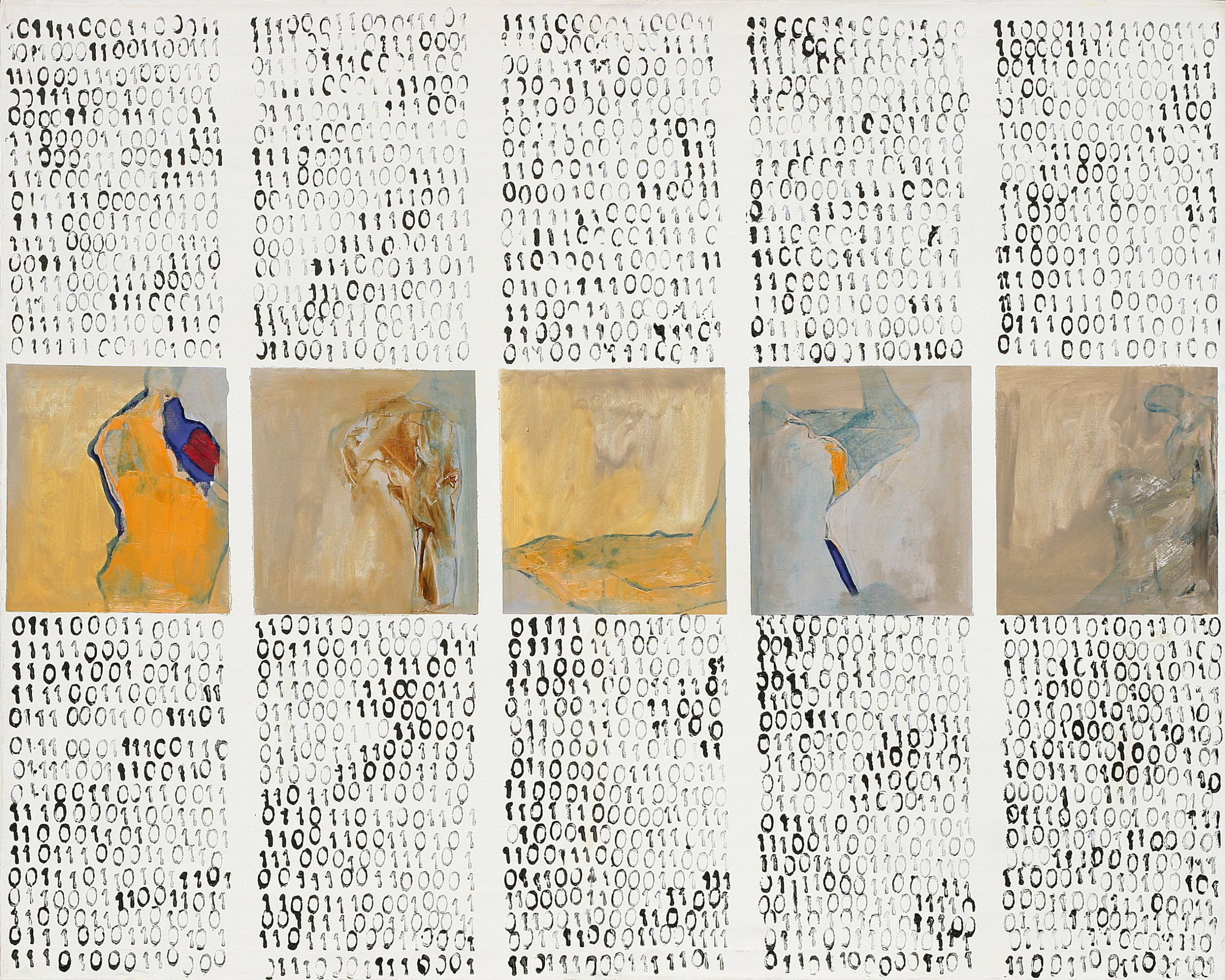 Na obrazie widać niecodzienną mieszankę kodu binarnego z abstrakcyjnymi, malarskimi formami. Tła sześciu kwadratów pokryte są subtelnymi odcieniami beżu i pomarańczu, przez które przebijają się delikatnie, chaotyczne plamy kolorów. Kompozycja przyciąga wzrok symetrycznym rozłożeniem elementów, gdzie cyfry zero i jeden tworzą tło pełne tajemniczych treści. Atmosfera jaka emanuje z dzieła, to intryga połączona z nutą futurystycznej fantazji. Kto by pomyslał, że cyfry mogą być tak creative! Artystyczny styl łączy tradycyjne malarstwo z elementami nowoczesności, a technika wydaje się być miksem farb olejnych z digitalowym wpływem. Ten obraz może wywoływać różne emocje, od zaciekawienia po lekki niepokój, sugerując kontrast między ludzką naturą a technologią. Przypomina to odwieczną walkę między naturą a cywilizacją. Dla jednych będzie to wizualna zagadka, dla innych po prostu piękny chaos. Pisząc ten opis, czuję się, jakbym zagłębiał się w skomplikowaną układankę, której każdy element ma swoje miejsce. Może nie jest łatwo pojąć każde znaczenie, ale to jest właśnie the fun. To tak, jakby nagle odkryć, że cyfry mają swoje życie.