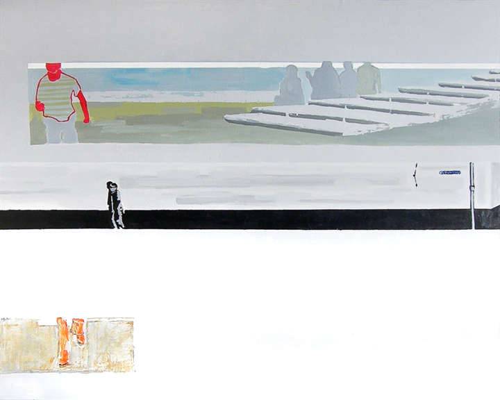 Na obrazie dominują chłodne, pastelowe kolory. Szarości przeplatają się z odcieniami beżu i delikatnym niebieskim, tworząc spokojny, niemal minimalistyczny pejzaż. Kompozycja skupia się na podziale przestrzeni, gdzie górna część przyciąga wzrok sylwetkami ludzi i nieregularnymi liniami przypominającymi schody. Na dole widzimy kontrastującą, mocną linię, pod którą rozpościera się czysta biel. Taki układ nadaje dziełu spokojny klimat, choć nieco zagadkowy. Styl artysty można by nazwać nowoczesnym, z naciskiem na prostotę i jasność formy. Minimalistyczne podejście z elementami wizualnego zakłócenia sugeruje wpływy sztuki współczesnej. Jest to jakby "calm chaos" – coś zwyczajnego, lecz intrygującego. Zaskakuje prostota formy, a mimo to obraz wywołuje głębokie refleksje o codzienności. Może nawet lekko melancholijny nastrój. Osoba oglądająca może odnieść wrażenie pewnej nostalgii. Kto nie tęskni za beztroskim dniem nad morzem, a może to miasto? Ta interpretacja zależy od widza, czy dostrzeże w tym puste ulice, czy relaksujący widok. Wyobrażam sobie, że siedzę tam i patrzę na ludzi w oddali. Obraz przyciąga wzrok i zachęca do zatrzymania się na chwilę refleksji. Coś jak: "Mamo, ten obraz jest fajny, bo można długo na niego patrzeć." To właśnie jego siła – prostota, która niesie głęboki ładunek emocjonalny, pozostając w pamięci na długi czas.