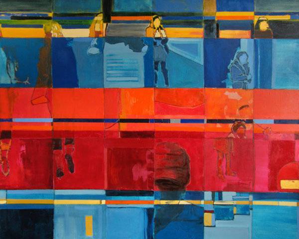 Obraz mieniący się intensywnymi kolorami, przeważają tu czerwienie i błękity. Dynamiczne prostokąty i kwadraty układają się w strukturalną mozaikę, przypominającą miejską panoramę. Każdy z elementów wydaje się żyć własnym życiem, jakby chciał opowiedzieć swoją historię. Ten obraz to prawdziwy festiwal barw, które wydają się tańczyć w rytmie miejskiego gwaru. Atmosfera dzieła jest pełna energii i ruchu, niemalże słychać szum ulic. Technika użyta przez artystę, być może inspired by kubizm, zachęca do eksploracji każdego zakamarka obrazu. Abstrakcyjne kształty mogą budzić różnorodne emocje: od zachwytu po zagubienie. Wzbudza ciekawość i chęć odkrycia, co kryje się za każdym rogiem. Dla mnie to jak odkrywanie nowego miasta. "To wygląda jak obraz w kratkę!" - powiedziałaby 7-latka. Obraz wieloznaczny, dający wolność interpretacji, lecz z pewnością wciąga swoją tajemniczością jak magnes.