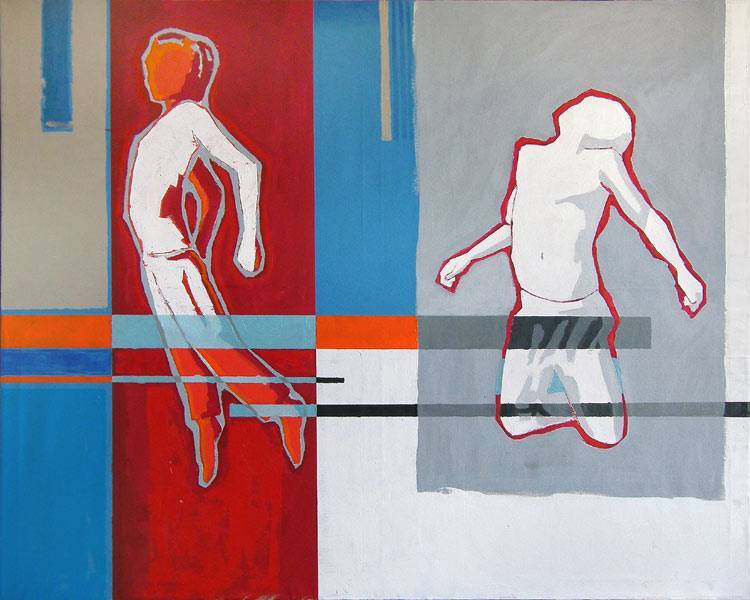 Obraz jest pełen żywych kolorów i geometrycznych kształtów, które przyciągają wzrok. Dominują czerwone, niebieskie i szare prostokąty, przez które przeplatają się postacie ludzkie, jakby uwiezione w tańcu z przestrzenią. Sylwetki przypominają szkice z dziecinną prostotą i radosnym ruchem. Artysta zgrabnie użył kontrastu między intensywnym czerwonym a spokojnym niebieskim, tworząc dynamiczną i energetyczną kompozycję. A może te osoby naprawdę tańczą? Styl jest nietypowy, trochę abstrakcyjny, jakby wyjęty prosto z kolorowej książki o sztuce współczesnej. Całość emanuje młodzieńczą energią i beztroską, jednocześnie zmuszając do refleksji nad ulotnością chwili. Technika mieszania kolorów i płaskie formy dodają obrazowi nowoczesnego, a nawet futurystycznego charakteru, giving it a fresh look. Można zastanawiać się, co te postacie czują - radość, wolność, maybe nawet odrobina zagubienia? Obraz może kojarzyć się z wolnością, jakiej doznajemy podczas skoku do wody w upalny dzień. „Ja też chcę tak skakać!” powiedziałoby dziecko, widząc te figury w ruchu. Moje pierwsze wrażenie? Fascynacja i nostalgia za beztroskimi dniami. To jak uchwycenie chwili pełnej potencjału i niekończącej się zabawy. Idealnie nadaje się do wnętrza, które potrzebuje trochę pozytywnej energii. I tak, można powiedzieć, że to dzieło sztuki przyciąga, bo każdy z nas chociaż raz w życiu chciał być tak wolny i pełen energii.