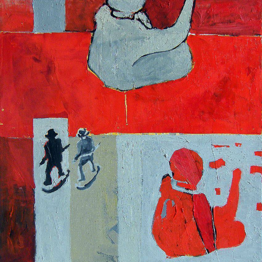 Ten obraz emanuje intensywnymi tonami czerwieni i szarości, które dominują całą kompozycję. Kształty są zgeometryzowane, niemal abstrakcyjne, co tworzy wrażenie pewnej surowości i tajemniczości. Sylwetki dwóch postaci odcinają się od reszty, nadając całości dynamiczności. Przypominają oni cienie podróżników, zagubionych gdzieś w przestrzeni między światami. Jest coś fascynującego w tej nieskończonej drodze, którą mogą symbolizować. Atmosfera jest jakby zawieszona, a w powietrzu unosi się nuta nostalgic i niepewności. To jak wejście do innego wymiaru, gdzie czas płynie inaczej. Artysta zastosował techniki, które łączą w sobie ekspresjonizm i abstrakcjonizm. Nietypowe pociągnięcia pędzla, geometryczne podziały - sprawiają, że obraz jest zarazem prosty i skomplikowany. Może wywołać uczucie zagubienia u widza, ale i fascynację. "Patrzcie, jak ci ludzie idą sobie na spacer", powiedziałby pewnie mały człowiek, który patrzy na ten obraz. Mnie osobiście nasuwa się zwrot "journey", jak na określenie podróży, której destynacja jest tajemnicą. Jest w tym coś niesamowicie intrygującego i jednocześnie kojącego. Obraz zmusza do refleksji nad samym sensem wędrówki, nad jej kierunkiem i celem. Fascynujący, prawda?