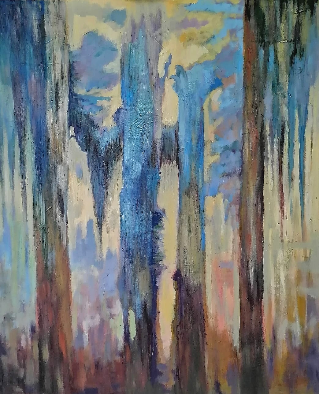 Obraz emanuje niezwykłą mieszanką kolorów, gdzie dominują chłodne odcienie niebieskiego, przeplatając się z cieplejszymi tonami beżu i brązu. Kształty są rozmyte, lekko rozmazane, przypominając wysokie kolumny lub drzewa. Kompozycja sugeruje pewną dynamikę, jakby wszystko wkradało się we mgłę tajemnicy. Artysta użył techniki przypominającej impresjonizm, gdzie pociągnięcia pędzla są wyraźne, ale jednocześnie miękkie. To coś jak kalejdoskop barw. Styl ten nadaje obrazowi lekko surrealistyczny klimat, wciągając widza w swój własny świat nieokreślonych form. Obraz może wywoływać uczucie spokoju, ale też lekkiego niepokoju. Czy czegoś nie dostrzegamy? Może właśnie o to chodzi, by skłonić do refleksji. Dziecko mogłoby powiedzieć: "To wygląda jak zaczarowany las!" Ta impresja sprawia, że zastanawiam się, co takiego kryje się w tych cieniach. Może to magiczny moment "between dreams", gdzie wszystko jest możliwe. Patrząc na niego, czuć dotyk melancholii, a jednak coś intrygującego przyciąga uwagę. Emocjonalna reakcja? Ciepło z nutą tajemnicy. Ach, czyż to nie jest piękne?