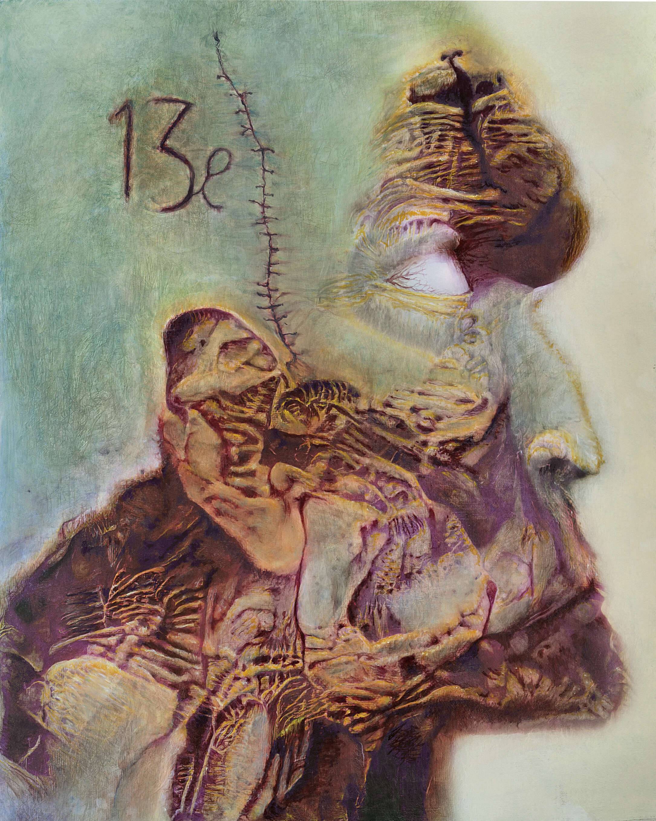 Obraz, który mamy przed sobą, to prawdziwa uczta dla oczu. Wzrok od razu przyciąga znana liczba "13" umieszczona w lewym górnym rogu, co dodaje tajemniczości. Kolory są stonowane, dominują odcienie zieleni i brązu, a całość otulona jest lekką poświatą bieli. Kompozycja ukazuje profil twarzy, choć nie jest to zwykły portret. Kształty są niestandardowe, rozmyte i pełne organicznych wzorów. Artysta zastosował technikę mieszającą realizm z surrealistycznymi akcentami. To przypomina dreamland z płócien Salvadora Dalego. Atmosfera obrazu jest nieco niepokojąca, ale też intrygująca. Nasuwa pytanie: co tam się dzieje? Styl artystyczny jest unikalny, śmiała paleta kolorów i tekstury dodają wymiaru głębi emocji. "Wow, ale dziwne, fajne!" pomyśli dziecko, gdy spojrzy na ten obraz. Interpretacja dzieła może wywoływać różne emocje. Dla jednych to będzie symbol dekonstrukcji czy przemijania. Inni zobaczą w nim odzwierciedlenie własnych lęków i niepewności. Sam osobiście czuję pewien niepokój, ale i fascynację tym, jak zwykłe elementy mogą być przedstawione w nowy, nieoczywisty sposób. Obraz zaskakuje i skłania do refleksji. To takie "enigmatic" arcydzieło, które przyciąga wzrok i nie pozwala o sobie zapomnieć.